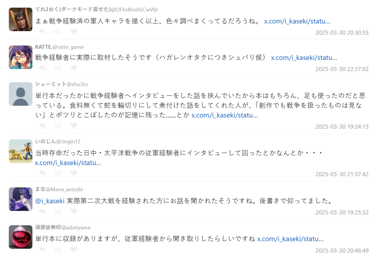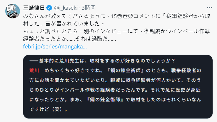 不少對《鋼之鍊金術師》熟悉的粉絲加入討論,表示印象中,單行本裡有提到訪問戰爭經歷者的事。不只是查資料,荒川弘老師還親自去採訪參與過第二次世界大戰的老兵。畢竟要塑造有戰爭經歷的軍人角色,應該會做不少調查吧。