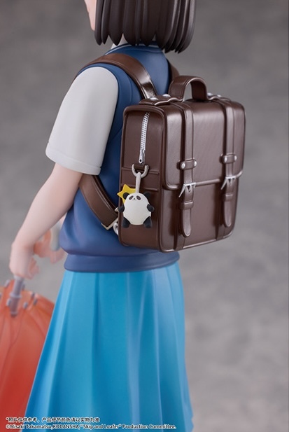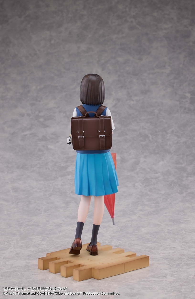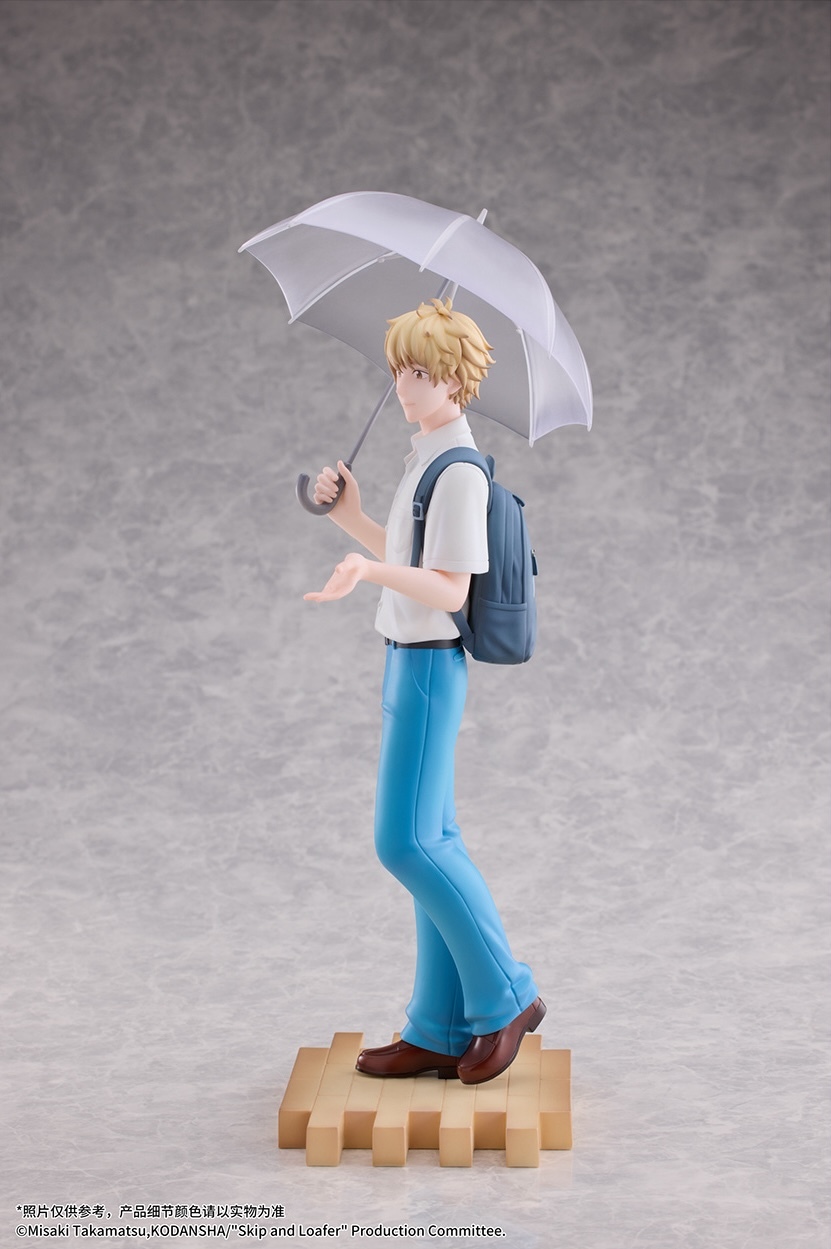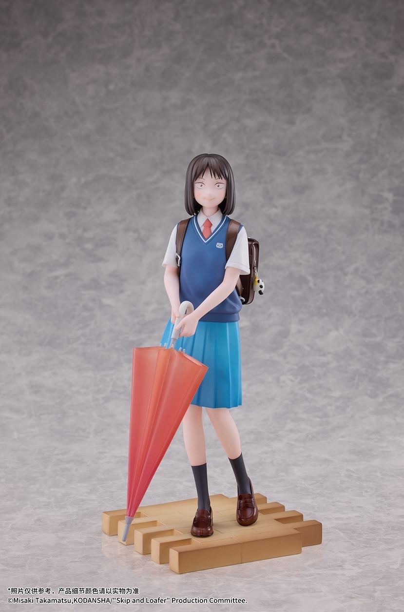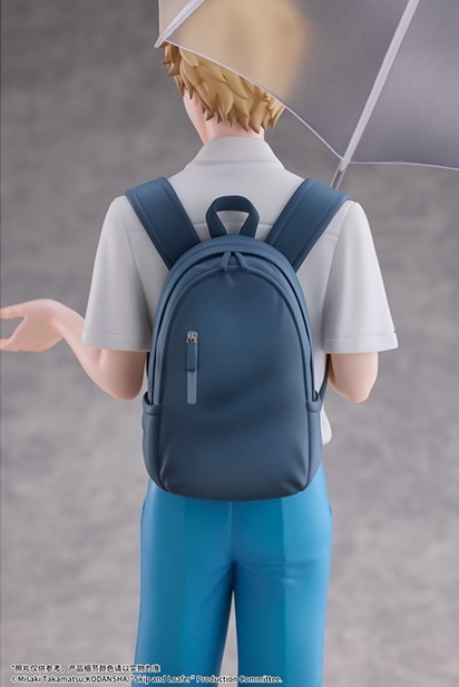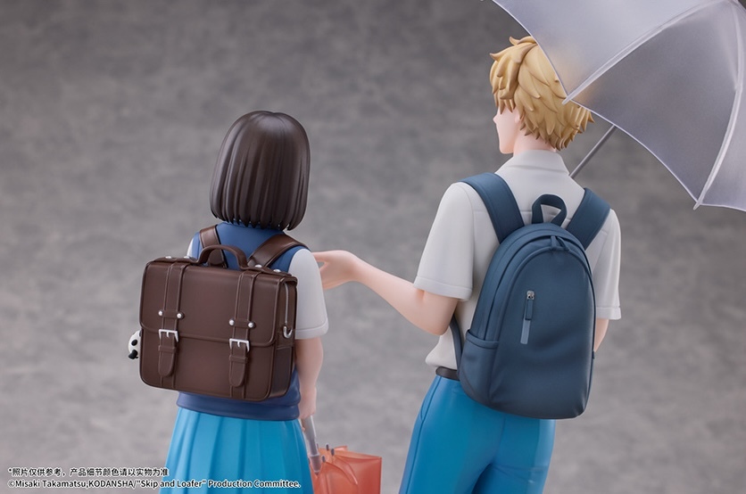 本次的兩件1/7比例塗裝完成品採用了兩人身著燕西高中制服的造型。志摩君高約30公分,為他打造了撐起透明傘的動態,美津未則高約23公分,製作了準備開啟紅傘的姿態,雕刻細膩呈現出兩人制服上的皺摺細節,美津未書包上的熊貓吊飾也被細膩再現!底座製作了木地板的造型,可以透過卡楯結構將兩件作品結合,呈現像是下雨的午後,兩人準備一起撐傘回家的可愛場景!