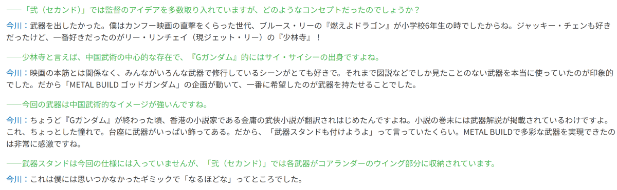 今川 : 剛好在《G鋼彈》播畢不久後,香港與作家金庸的武俠小說開始翻譯出版,而小說的最後還有各種武器的解說,這讓我充滿了憧憬!所以我甚至提議:「要不要加個武器架?」這次 METAL BUILD 能夠實現多種武器的配置,讓我真的很感動。另外「神鋼彈貳」各種武器都能收納在核心飛翼的翼部,這點自己也沒想到,當初看到設計時,也忍不住喊 : 「喔~原來還能這樣搞!」