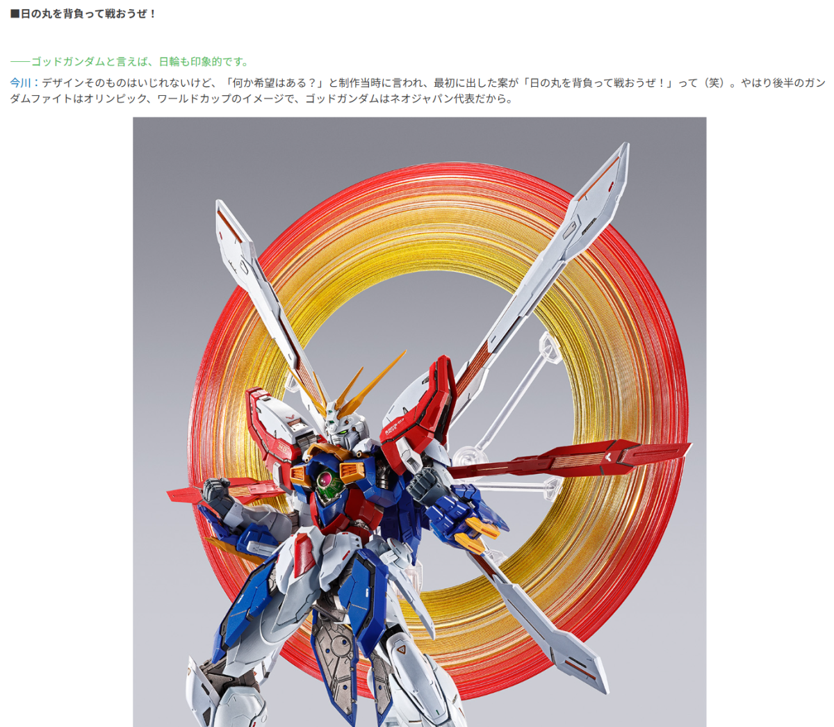 今川:雖然當初不能隨意改變機體設計,但當時製作團隊問我有沒有什麼希望,我馬上就說:「讓它背負日輪太陽旗去戰鬥吧!」(笑)畢竟後半段的鋼彈格鬥大賽,本來就有奧運、世界盃的感覺,而神鋼彈可是代表新日本的啊!
