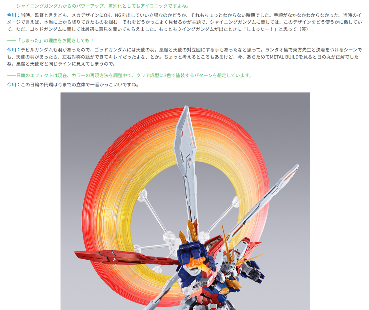 然而今日 ( 3/31 ) 萬代「TAMASHII NATIONS」的官方網站「魂WEB」公布了訪問《機動武鬥傳G鋼彈》動畫總導演今川泰宏的文章,他也是本次負責監修 METAL BUILD『神鋼彈&神鋼彈貳』的擔當,談論關於本次商品設計與當時動畫的感想。