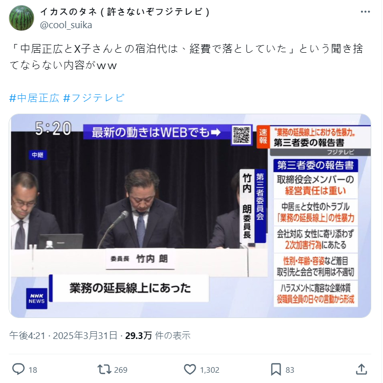 這報公帳的情況,也引起日本網民訕笑,富士電視台根本沒有理由逃脫這個責任。