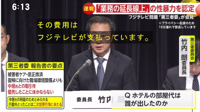 在記者提問環節中,有記者提問關於 2021 年 12 月於某國際連鎖飯店舉辦的飲酒聚會,該聚會地點為一晚約 40 萬日圓的總統套房,出席者包括藝人U先生、中居正廣、B先生,以及數名女性主播等。對此,委員長竹內朗表示該筆費用由富士電視台支付,且經費是由節目編成部高層以公費核銷的。