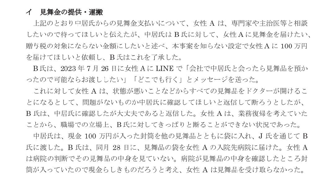 此外,報告也揭露,富士電視台一名高層曾受中居氏委託,以「慰問金」的名義,親自送現金 100 萬日圓給住院中的受害女性,形同「運送封口費的跑腿」。當時A小姐因身心狀況不佳而休養,明知A小姐病情嚴重,卻仍親自送現金過去,完全沒有考量她的身心狀況。