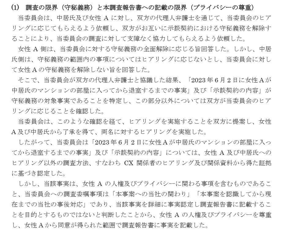 在這樣的情況下,第三方委員會與雙方律師進行協商,最終確認「2023年6月2日女性A進入中居先生公寓房間至離開的事實」以及「示談合約的具體內容」屬於保密義務範圍,這部分不納入調查。除此之外,雙方同意配合委員會的聽證調查。此外,針對未能公開的部分,委員會根據富士電視台相關人員的證詞及相關資料進行判斷,並在報告中明確指出:「女性A遭受中居正廣的性暴力」,且此事件屬於「重大的人權侵害」。