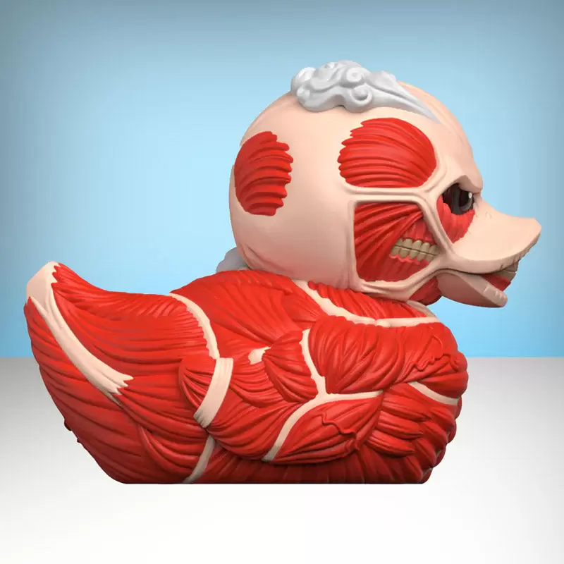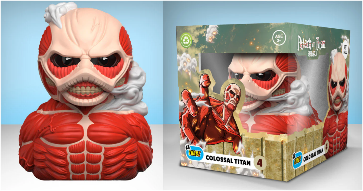 Numskull Designs 旗下大玩電玩遊戲、電影、動漫等 COSPLAY 的黃色小鴨-TUBBZ 系列「Cosplaying Duck Collectible」,這次與超人氣日本動畫《進擊的巨人》攜手,推出重量級商品「進擊的巨人 TUBBZ 超大型巨人 巨大 XL 版本」!參考售價為 $99.99,預計將於 2025 年 04 月發售。