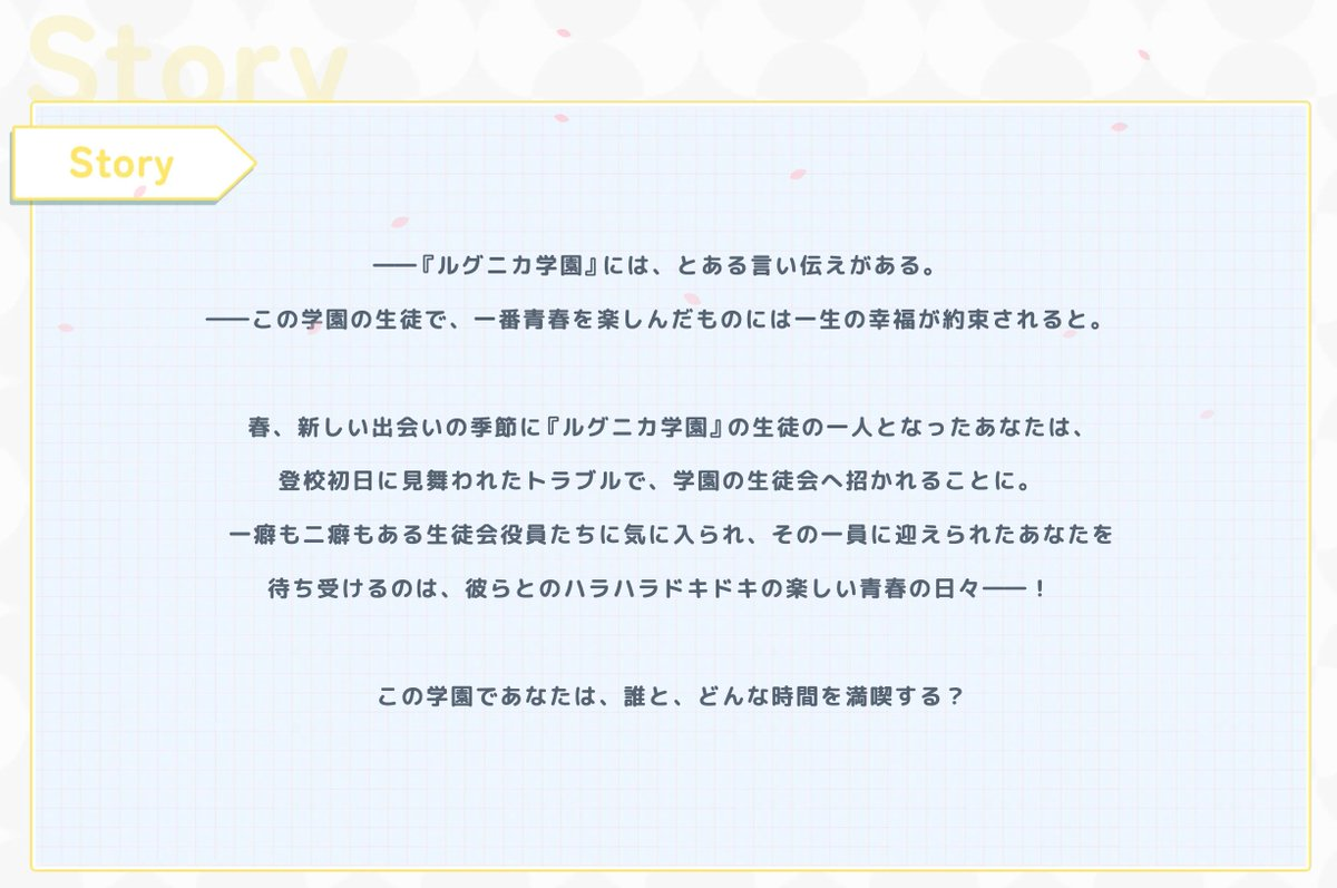 故事背景設定在「盧格尼卡學園」,這裡流傳著一個傳說「最能享受青春的人,將獲得一生的幸福」,玩家作為剛入學的新生,在開學第一天就因為某場突發事件,被帶到了學生會,並必須設法讓這群個性超強烈的學生會成員對你產生好感!?
