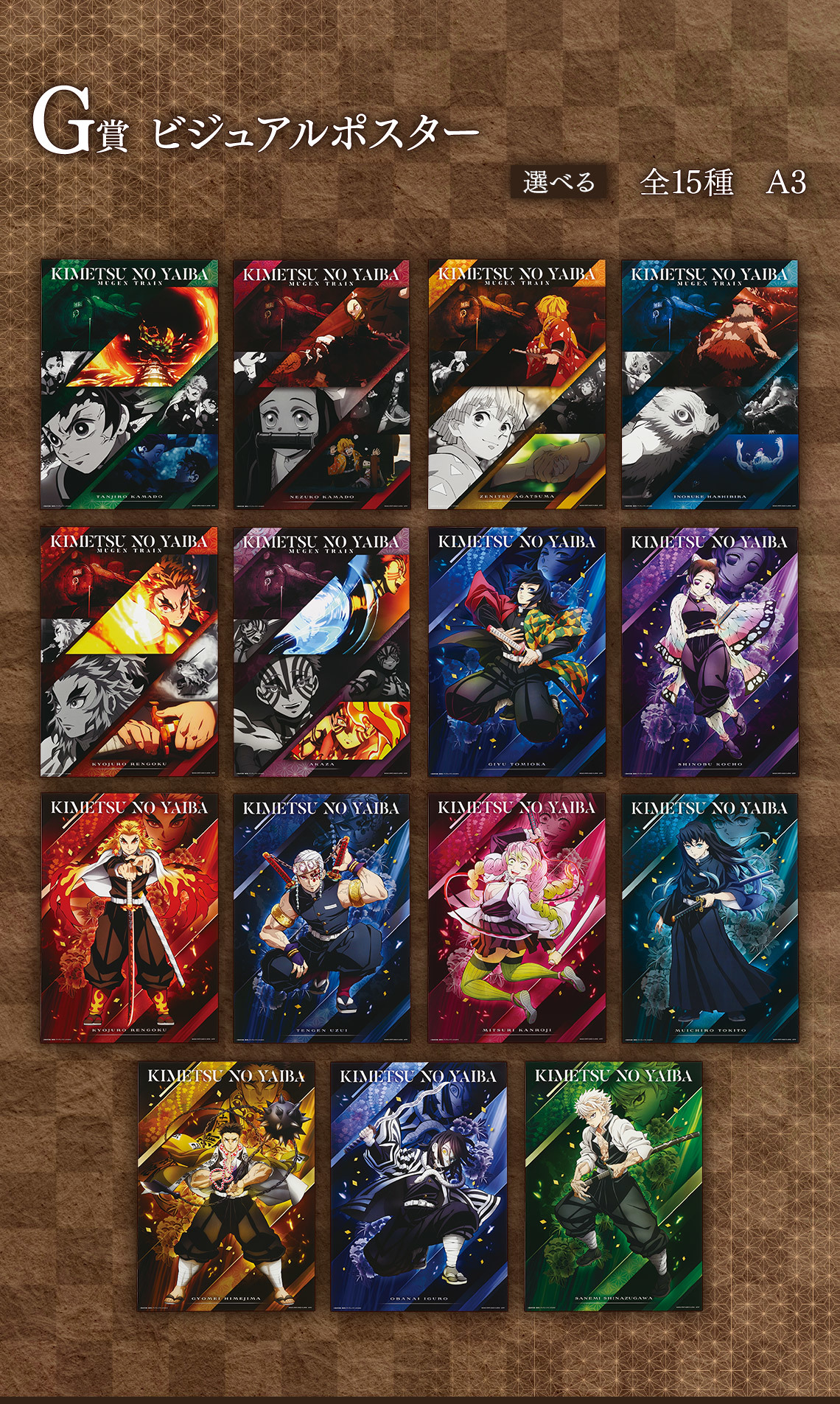 B~G賞分別為紀念浴巾、造型盤、ちょこのっこ(Q版娃娃)、壓克力吊飾~無限列車ver.~、金屬吊飾以及視覺海報,小編尤其喜歡F賞的金屬吊飾,收錄了車票、大哥的刀鍔等劇中登場物件或意象的造型,相當有質感!每一款賞品都印有精美的無限列車篇主題角色或物件插圖,帶各位玩具人重回電影的感動!