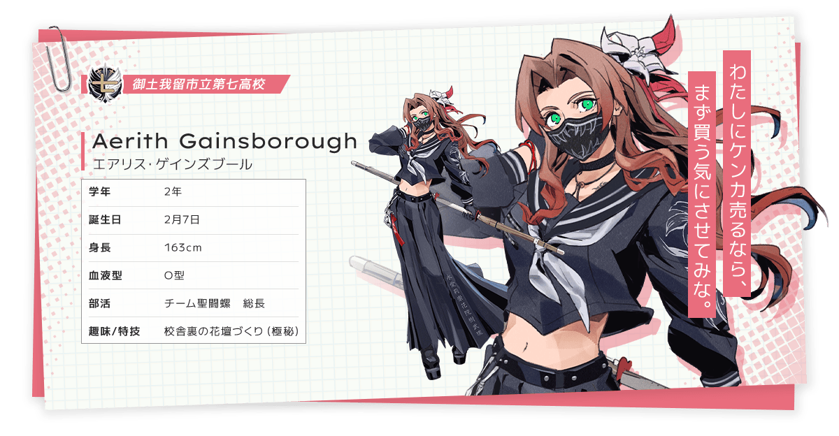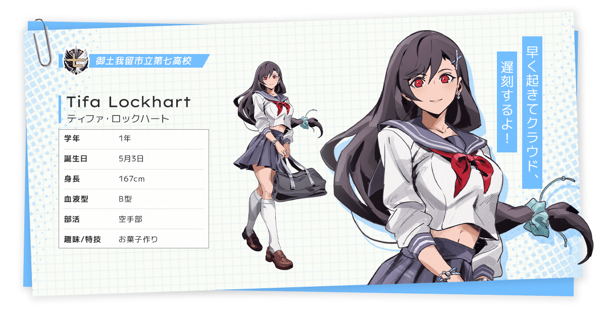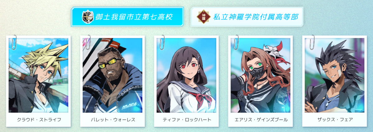 《Final Fantasy VII》系列的手機遊戲《Final Fantasy VII:永恆危機》也在今日釋出企劃「神羅學園」 ( エバクラ学園 ),將這些 FFVII 的角色進入校園之中,每位角色都有全新的造型設計,還開設了特別官網,讓不少粉絲讚賞這個趣味概念。