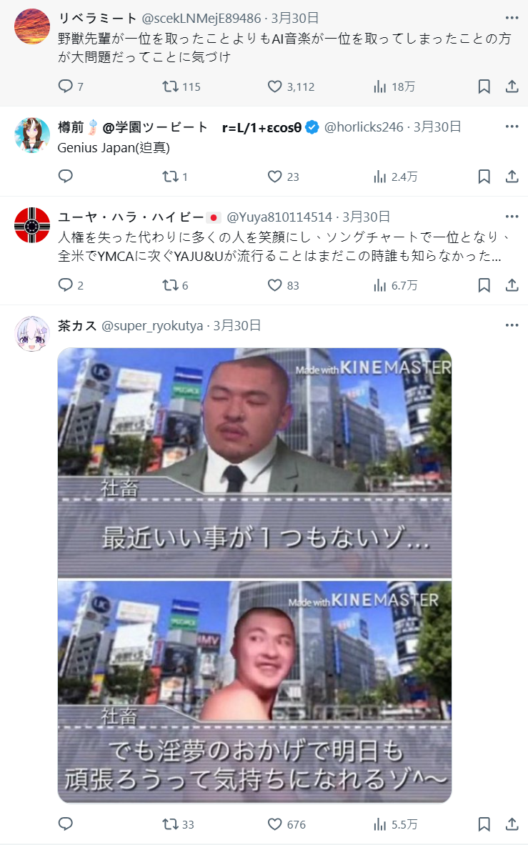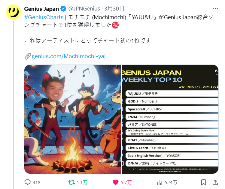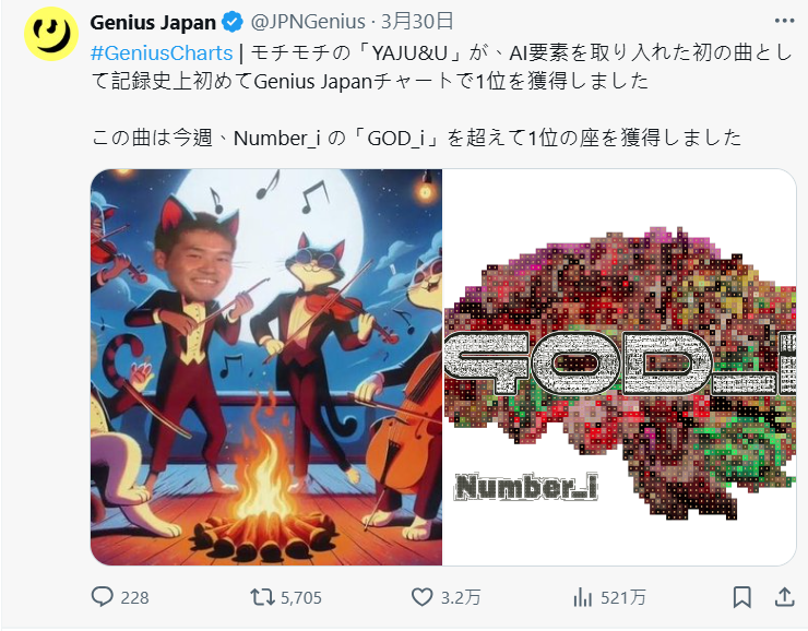 近日世界最大歌詞網站的 Genius 日本官方帳號發布,「YAJU&U」登上了Genius Japan 的綜合歌曲排行榜的第一名,這也是史上第一次,有 AI 要素的歌曲登上排行榜首位,也成為網民話題。