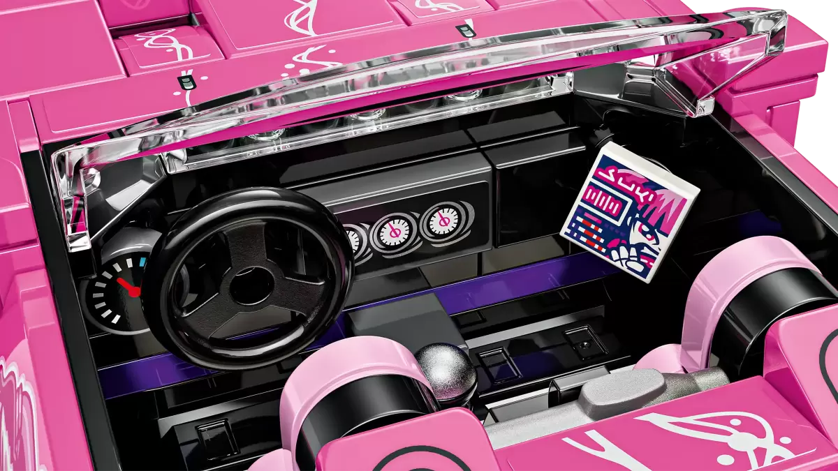本作一共有 300 片零件,組完之後長度來到 16 公分,充分再現了電影中街頭女車手「素姬 (Suki) 」的超高調粉紅賽車本田S2000,並以大量貼紙進行車身的點綴,同時也還原了輪圈、尾翼,以及顯眼的粉色座椅墊、儀表板、電視螢幕(TV monitor)等車內配置,整體的外觀可說是相當的華麗,肯定會是你各位眾多樂高車輛收藏中數一數二鮮艷的一台!當然,素姬的樂高人偶也有附上。