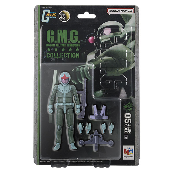 精選自「G.M.G.吉翁公國 一般駕駛服士兵」,將人偶與配件拆出來獨立販售、價格更便宜的「G.M.G. COLLECTION 06 吉翁公國 一般駕駛服士兵」,以 1/18 比例製作,在僅高約 10 公分的小尺寸中,製作出頭、雙臂、胸腰到腿部等多處可動關節,附有替換手勢零件與狙擊步槍、推進背包等配件。除此之外,商品包裝也改為泡殼吊卡形式,更便於展示收藏,設計也很帥氣!