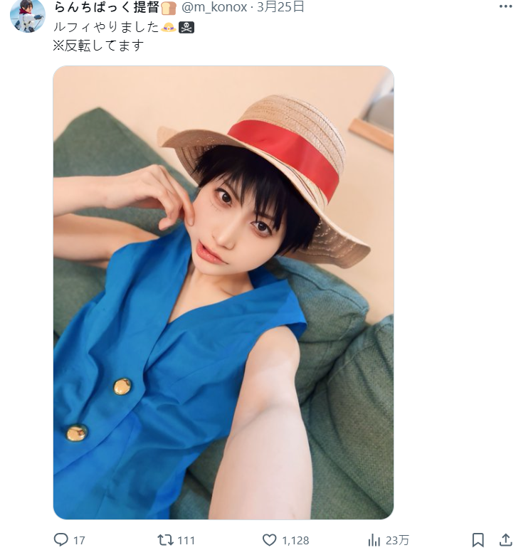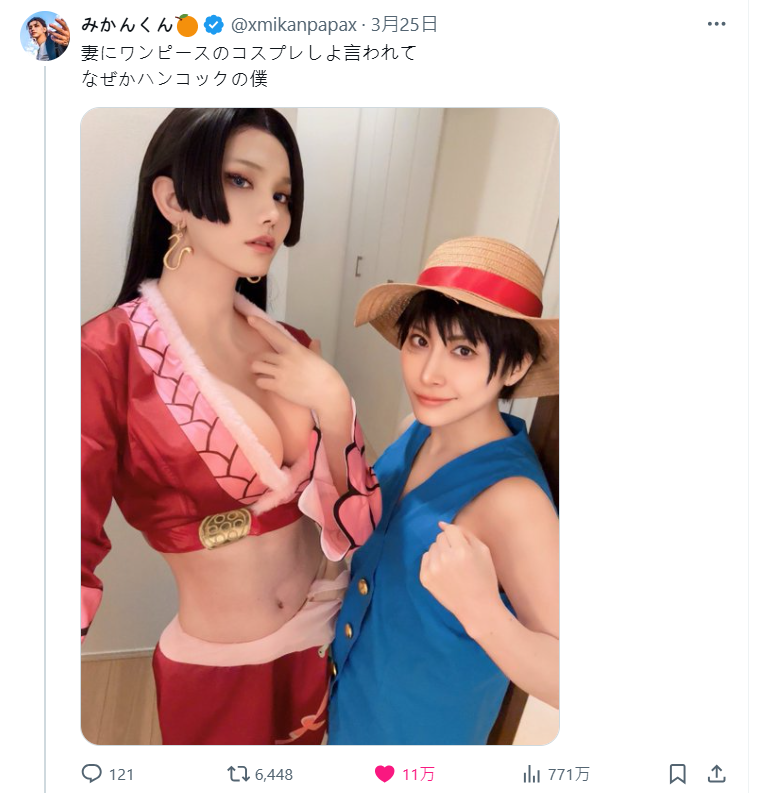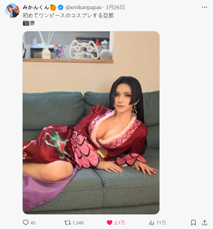 近日日本 X 上有位 Coserみかんくん(@xmikanpapax)引起熱議,因為他 Cos的《航海王》波雅・漢考克「女帝」Cosplay 照片。大家驚訝的點不只是 Cosplay 本身,而是這位扮演漢考克的人竟然是名男性,而旁邊的魯夫 Coser 則是他的老婆。這樣的景象也獲得網友絕讚不已,讚嘆他居然可以駕馭女帝的姿態
