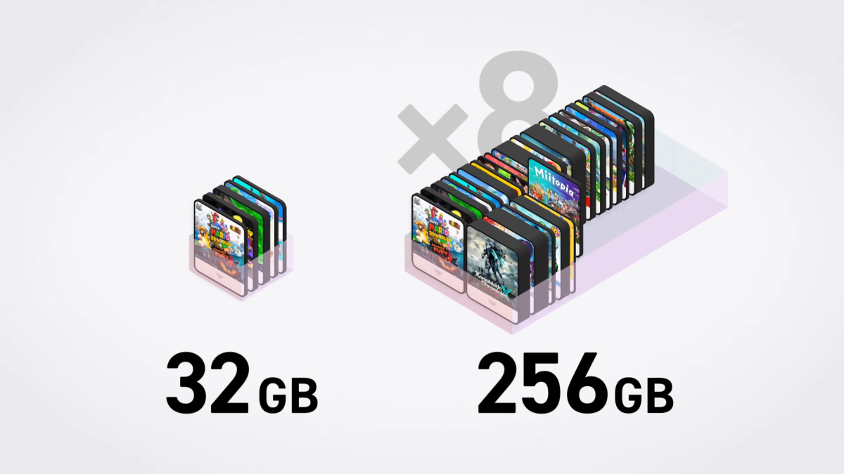 Nintendo Switch 2 內建 256GB 儲存空間,比前代的 32GB(標準版)與 64GB(OLED 版)大幅提升。這對於喜愛下載數位遊戲的玩家來說是一大福音,意味著可以存放更多遊戲與內容,而不必頻繁擔心存儲空間不足的問題。