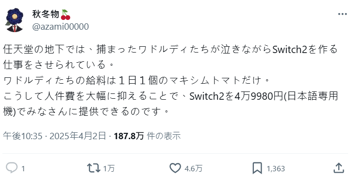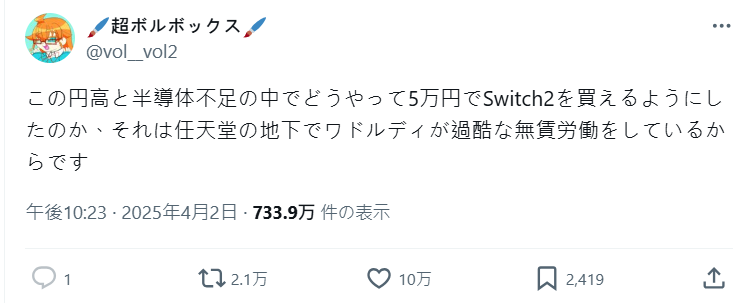 雖然有點沒來由,但是價格一公布後,不少網友認為這次在日圓貶值、半導體短缺的時代,究竟任天堂是如何壓低成本,讓玩家能用 5 萬日圓不到就買到 Switch2 呢?就流傳出「瓦豆魯迪勞動論」的奇妙玩笑。