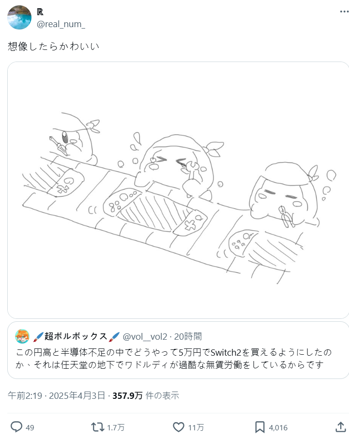 卻也在日本 X上開始流傳一個陰謀論,說 : 「任天堂的地下工廠裡,瓦豆魯迪們被關起來,一邊哭一邊趕工製造 Switch2」,沒想到這個玩笑,也意外成為話題,不少網友開始以此異想天開想出各種情境。
