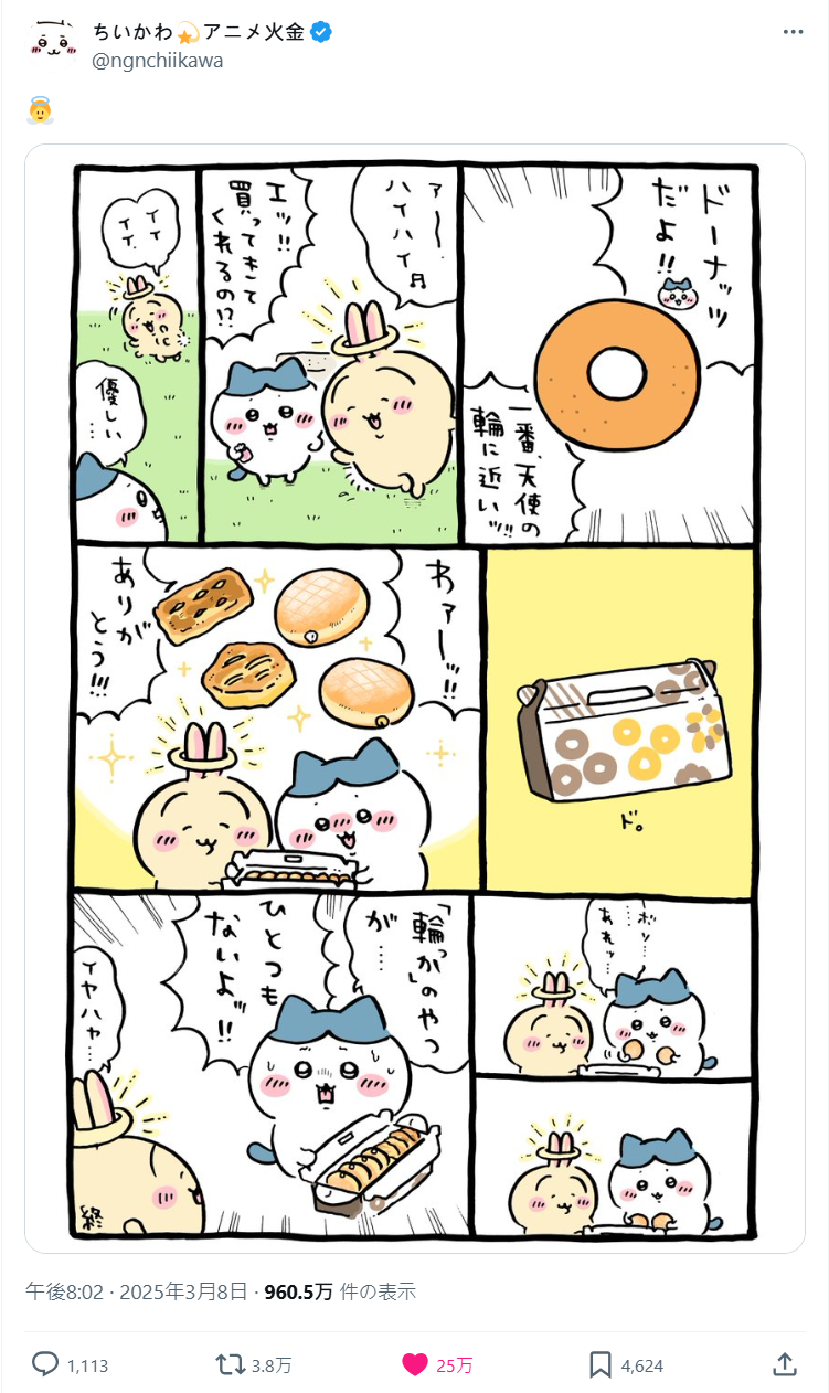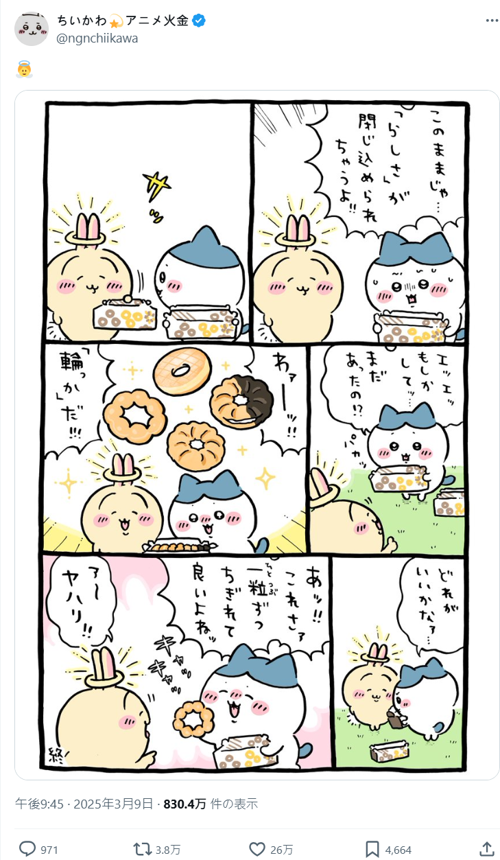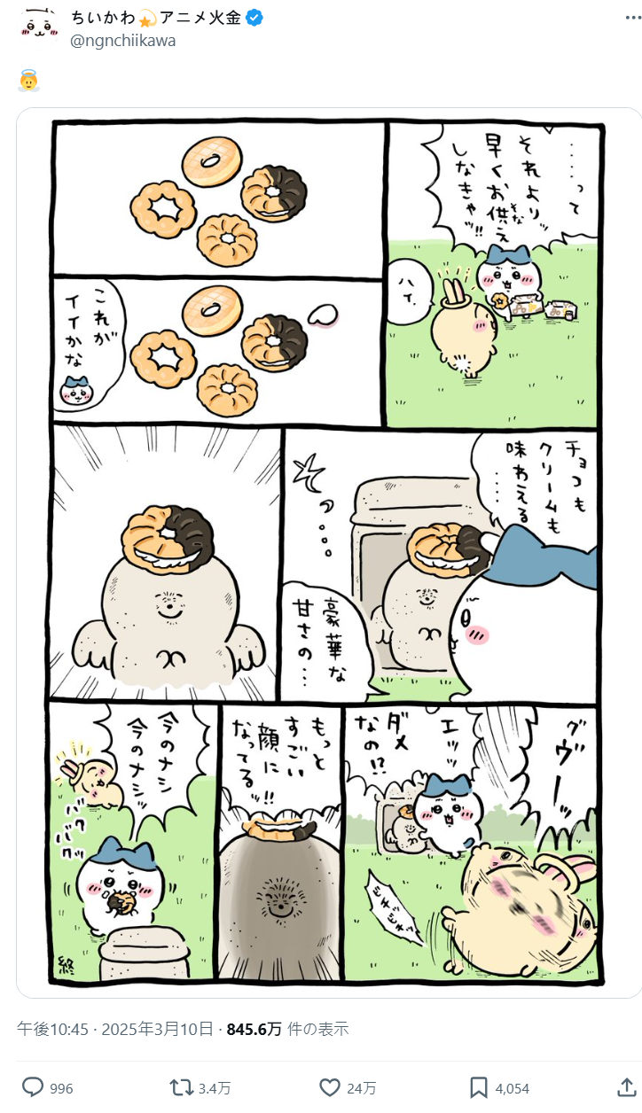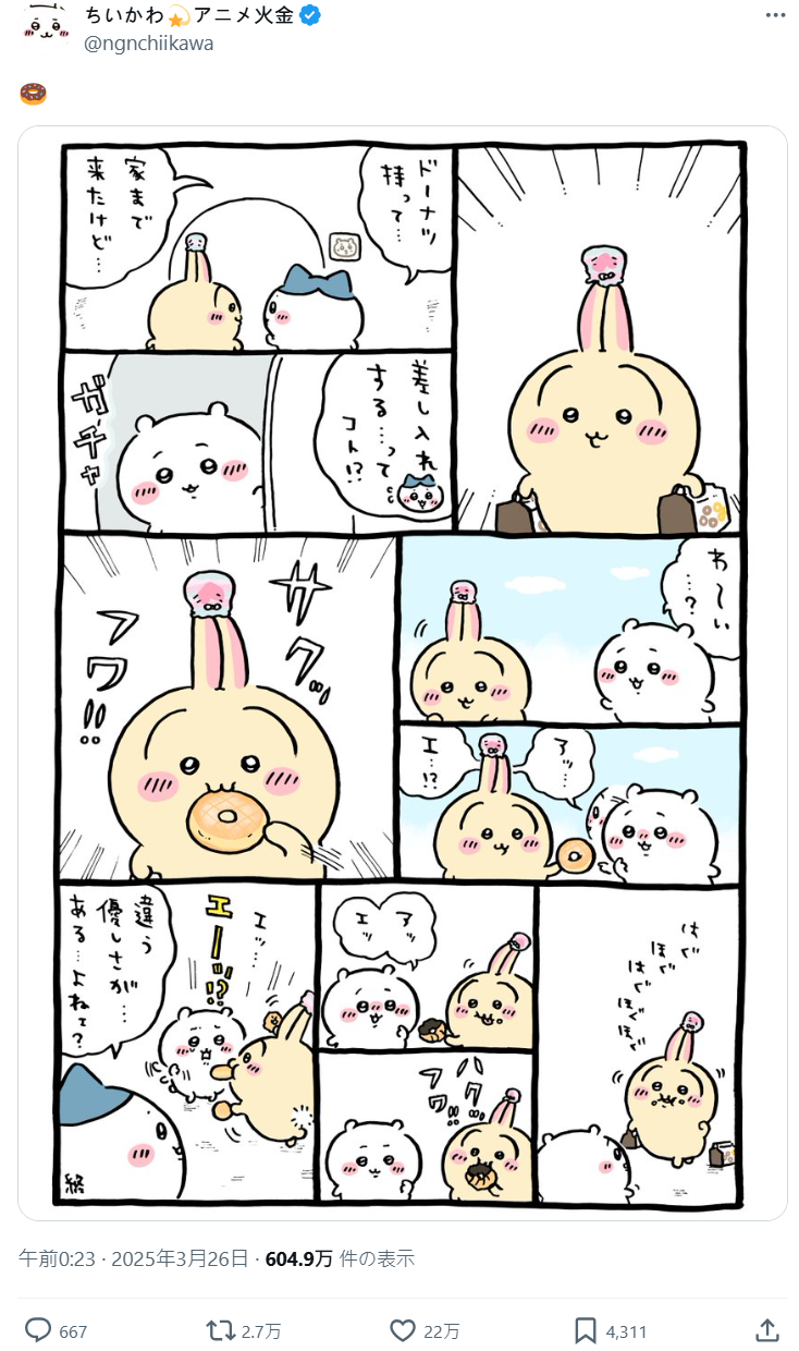 今日 ( 4/3 ) 官方發布了作者 NAGANO 老師的新插圖,就是吉伊、小八還有兔兔三位一起享用點心的模樣,也標上了「おいしいよ! ドーナツ いて いいよね」的羅拼音,讓不少粉絲開始臆測 : 「這該不會是在暗示聯名吧!!?」。