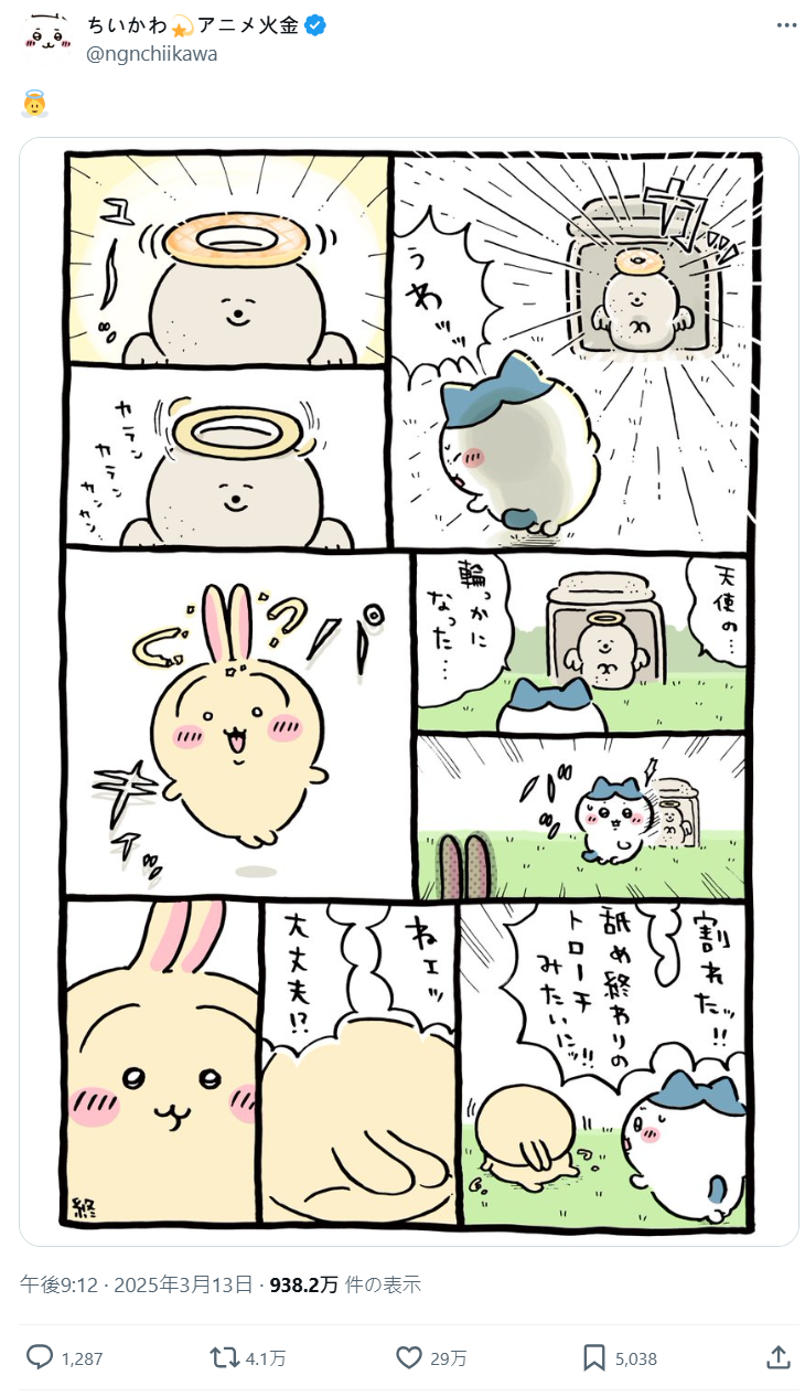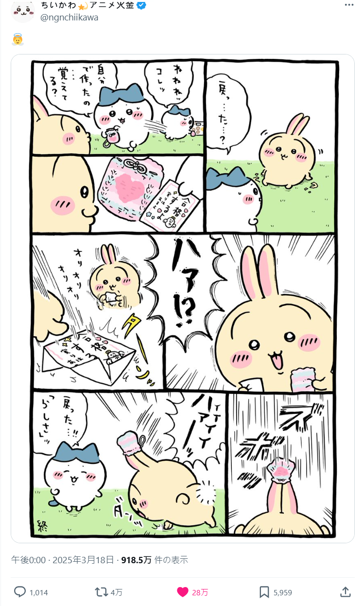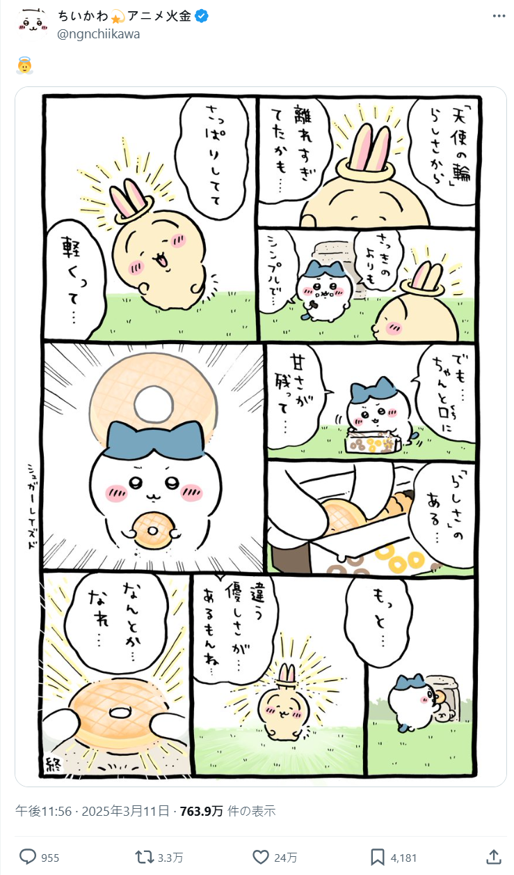 今日 ( 4/3 ) 官方發布了作者 NAGANO 老師的新插圖,就是吉伊、小八還有兔兔三位一起享用點心的模樣,也標上了「おいしいよ! ドーナツ いて いいよね」的羅拼音,讓不少粉絲開始臆測 : 「這該不會是在暗示聯名吧!!?」。