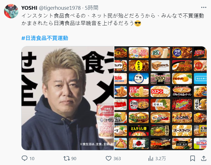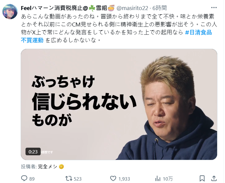 沒想到近日卻遇到了麻煩,因為日清旗下食品「完全メシ」系列找來日本知名前企業家堀江貴文拍攝廣告,這位非常有爭議的人士讓許多民眾感到不悅,認為日清居然找這種人來代言真的無法接受,甚至在 X 上也發起了所謂「日清食品不買運動」,甚至還登上了 X 趨勢關鍵熱搜。