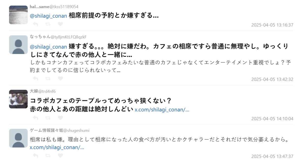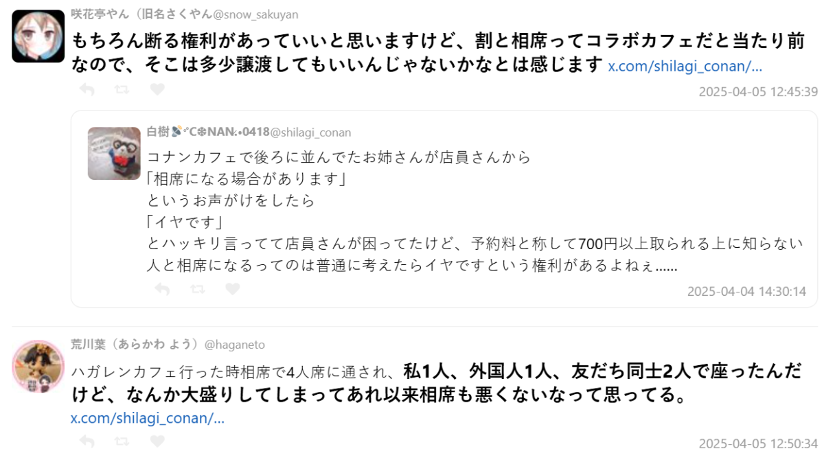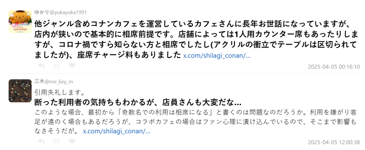近日日本 X 上,有位推主分享了自己到《名偵探柯南》聯名咖啡廳的情況,居然聽到有客人被店員提醒說「可能會需要併桌喔」,讓他大表疑惑,這究竟是否合理呢?這情況也獲得不少網友熱議。