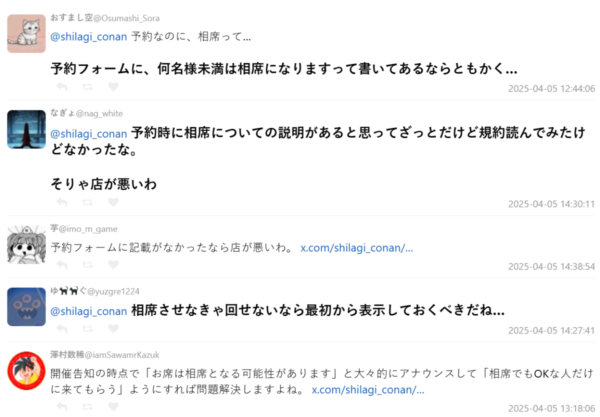 但說真的,這種情況也不是不能理解啦,畢竟都已經收了所謂「訂位費」700 日圓以上了,結果還要跟不認識的人一起併桌,站在消費者角度來看,覺得「我不想併桌」其實也是很合理的反應。
