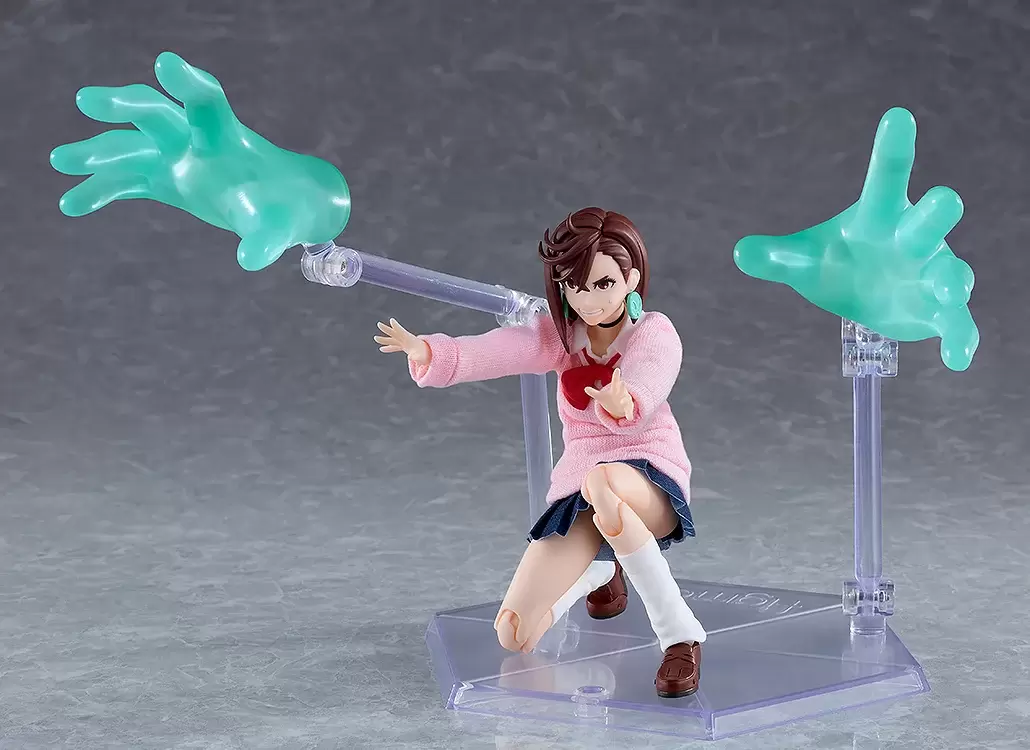 「figma 小桃」可動人偶,尺寸高約 14 公分,再現小桃標誌性的制服造型,最大亮點就是採用布料還原小桃特徵的桃色毛衣與超短的百褶裙!除了能夠表現寬鬆可愛的穿搭風格,也讓姿勢擺起來更加生動逼真。表情零件附有自信微笑的「普通臉」、迷人的瞇眼「笑臉」以及奮力咬牙的「戰鬥臉」三款可以替換,搭配「學校書包」、綠色大手「超能力特效零件」、「智慧型手機」,賞玩劇中情境!