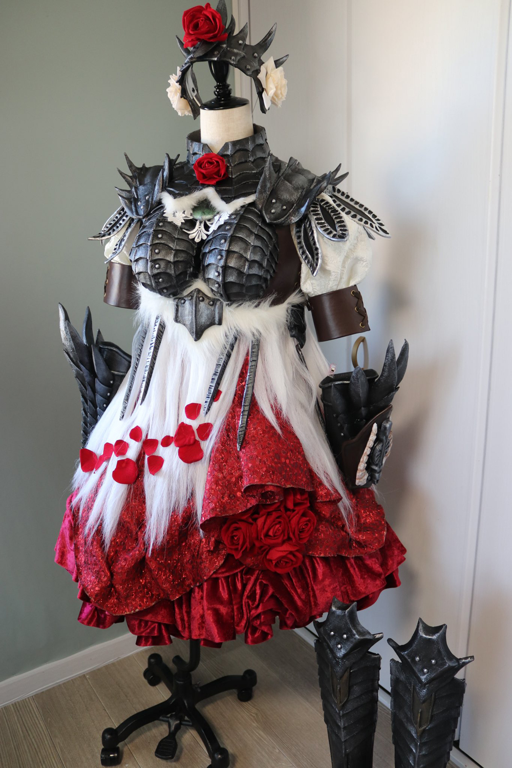 看成品還真以為是從遊戲中變出來的,沒想到推主能夠完美還原出一整套防具組,而且裝備上的細節也全都顧到了,不管是胸部和頭部那金屬的質感,還是裙擺那宛如玫瑰的華麗感,完完全全就是「刺花蜘蛛防具」!