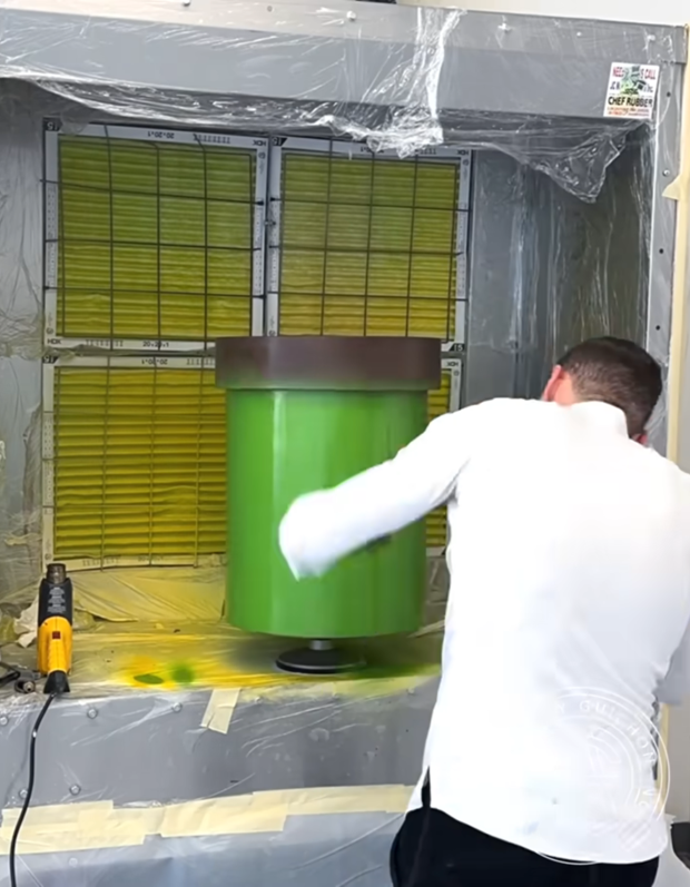 為了讓作品更有質感,Guichon 還幫整個巧克力雕像上色。他先用噴槍大致噴上底色,再用拌入色素的巧克力做出吊帶褲,讓整體看起來就像真的穿著衣服一樣,立體感十足。