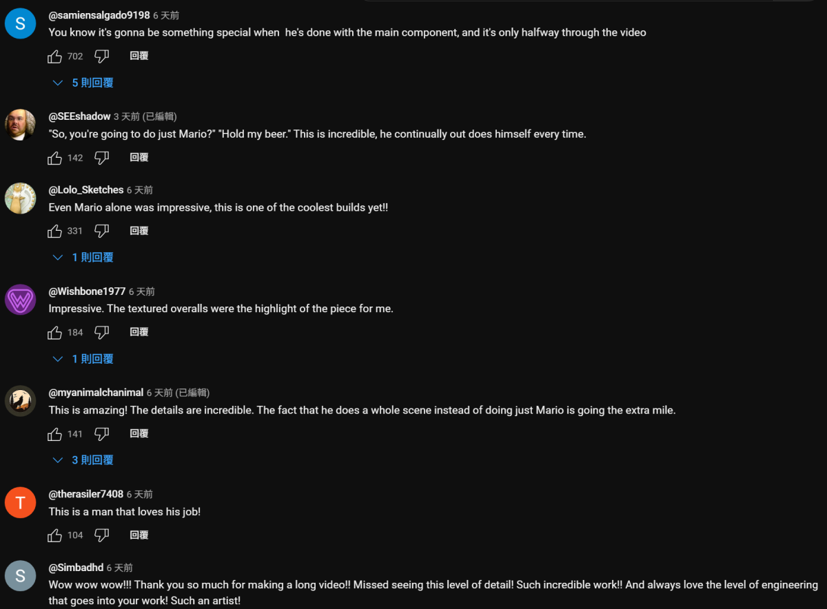 YouTube 底下也湧入大量留言:「真的太天才了!」、「這才華讓人佩服得五體投地」、「每一個細節都太神了吧」、「這應該是你目前最強的一件作品之一!」看來大家都被這甜點藝術震撼到了。