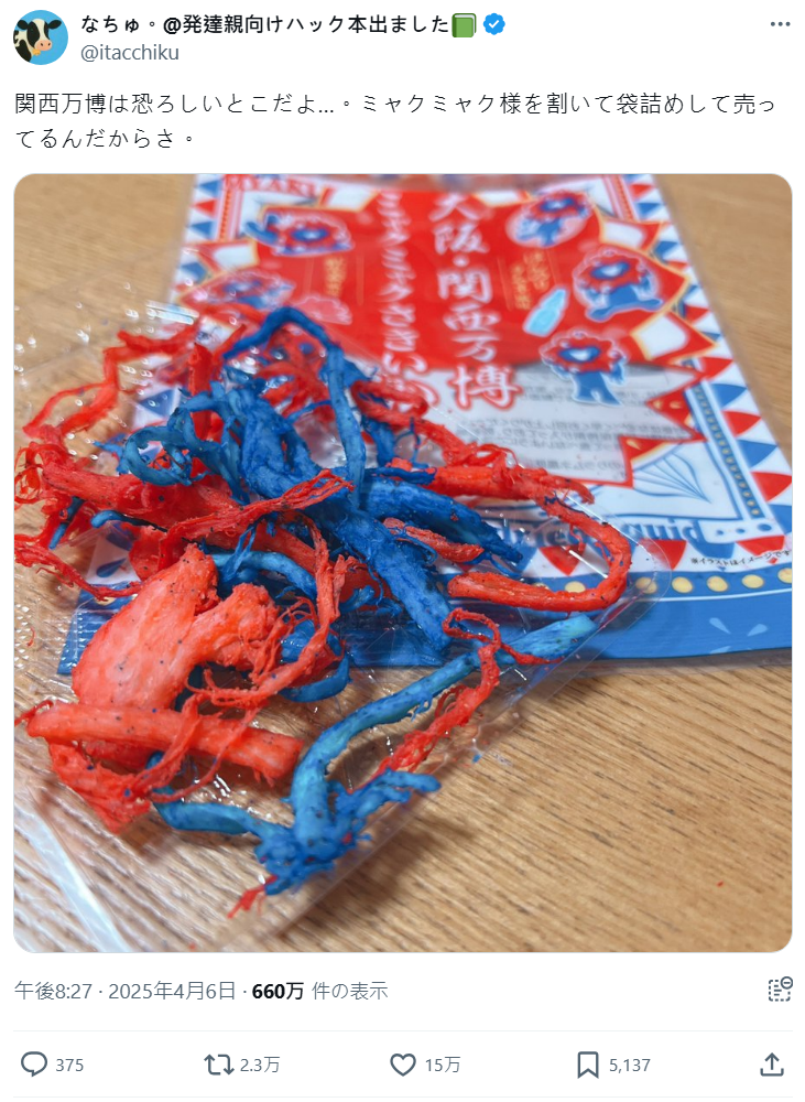發文受到關注的推主開玩笑說,關西世博真的是個有點可怕的地方耶……竟然把脈脈大人樣(ミャクミャク様)切開、裝袋,還拿出來賣,這也太驚人了吧。( 笑 )