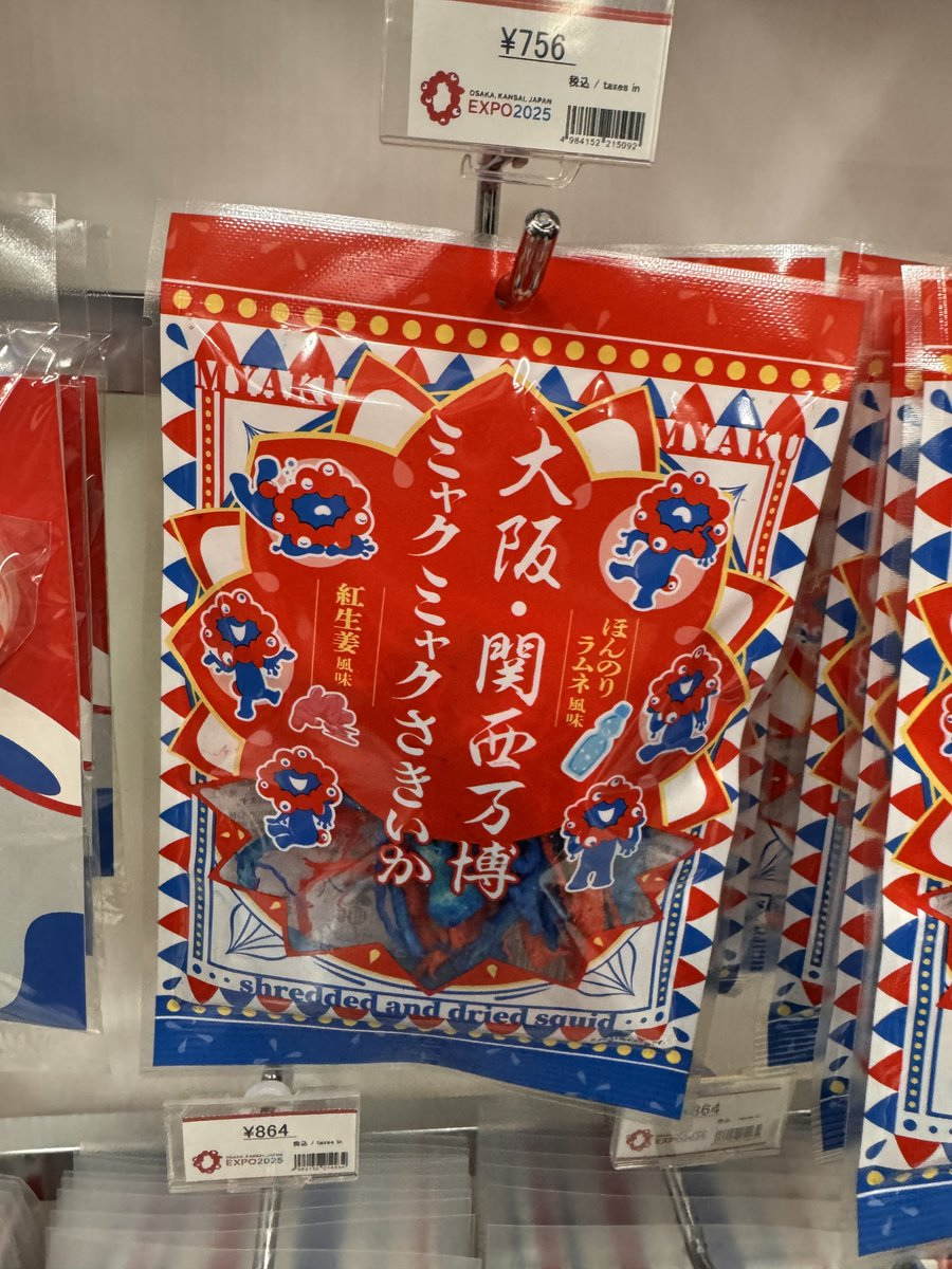 這款世博限定的「脈脈大人魷魚絲」,分別以紅藍雙色各為紅生薑與彈珠汽水口味,展開來的確有點像是血管...一個動脈一個靜脈,也有網友開玩笑說感覺好像會被牠從體內慢慢侵蝕一樣毛毛的。