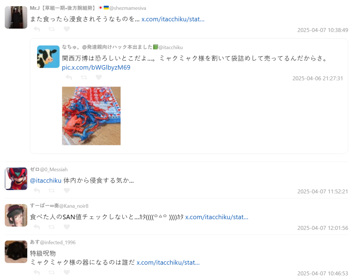 還有網友表示吃了可能會被脈脈侵蝕,就像特級咒物一樣寄宿在妳身體,會掉 SAN 值的東西阿 ( ? )
