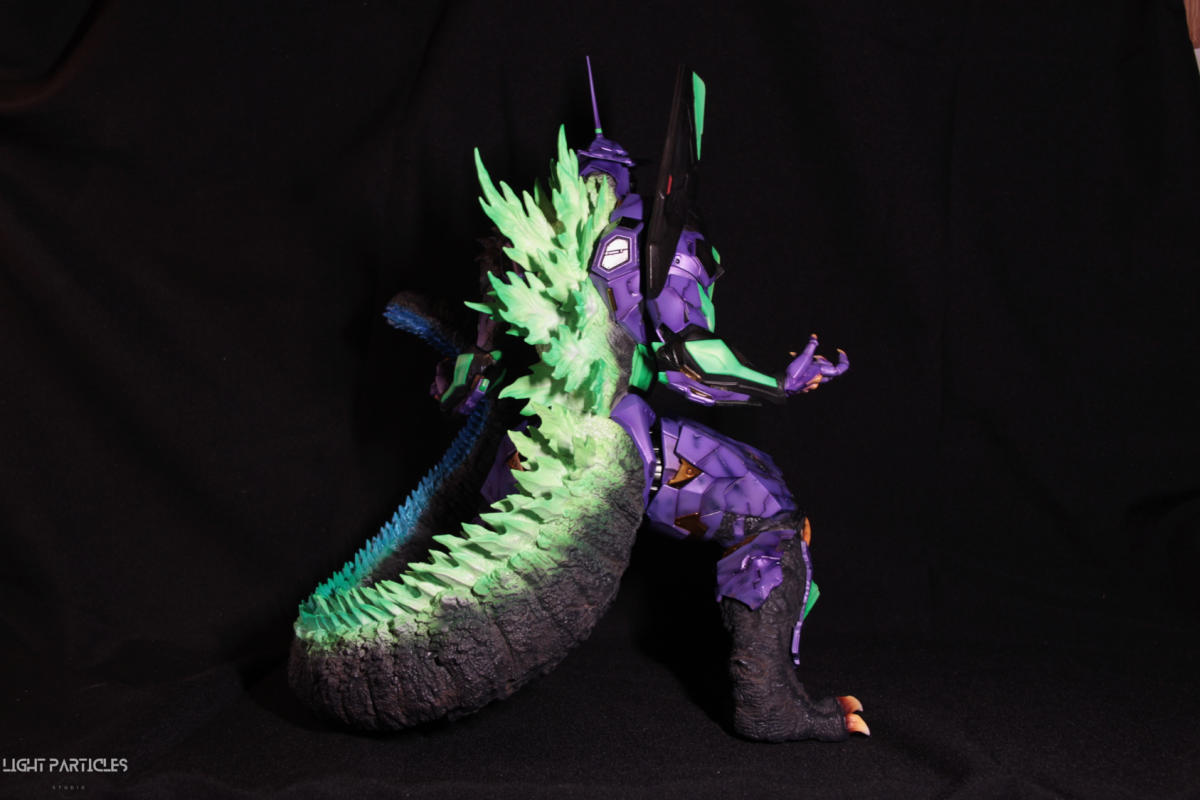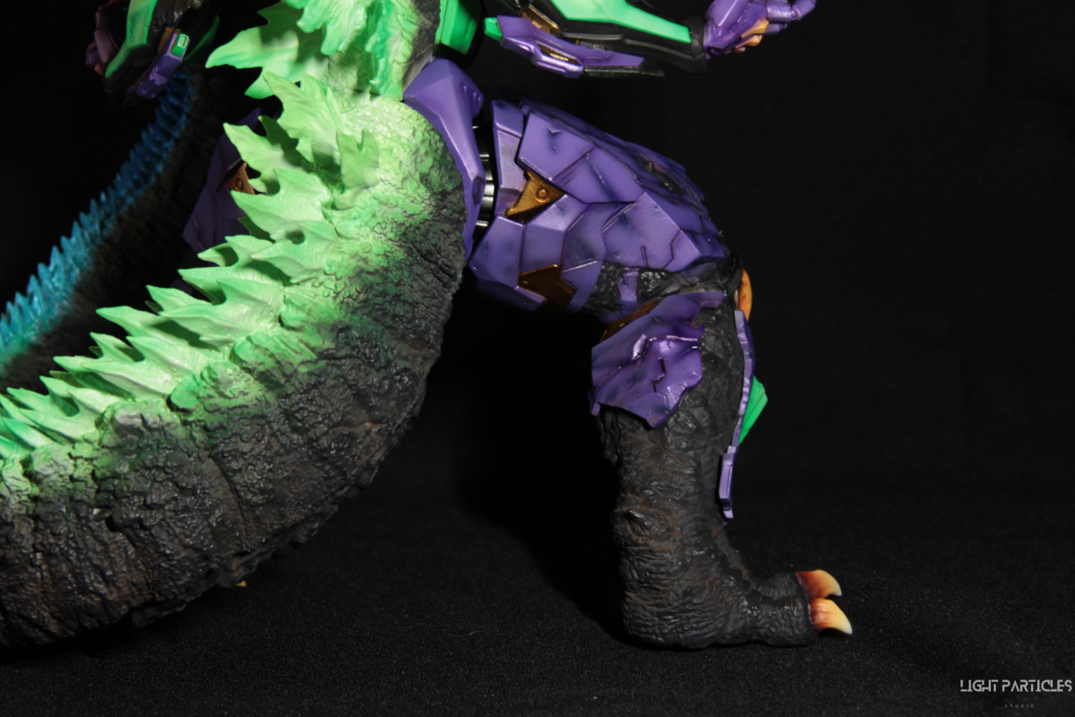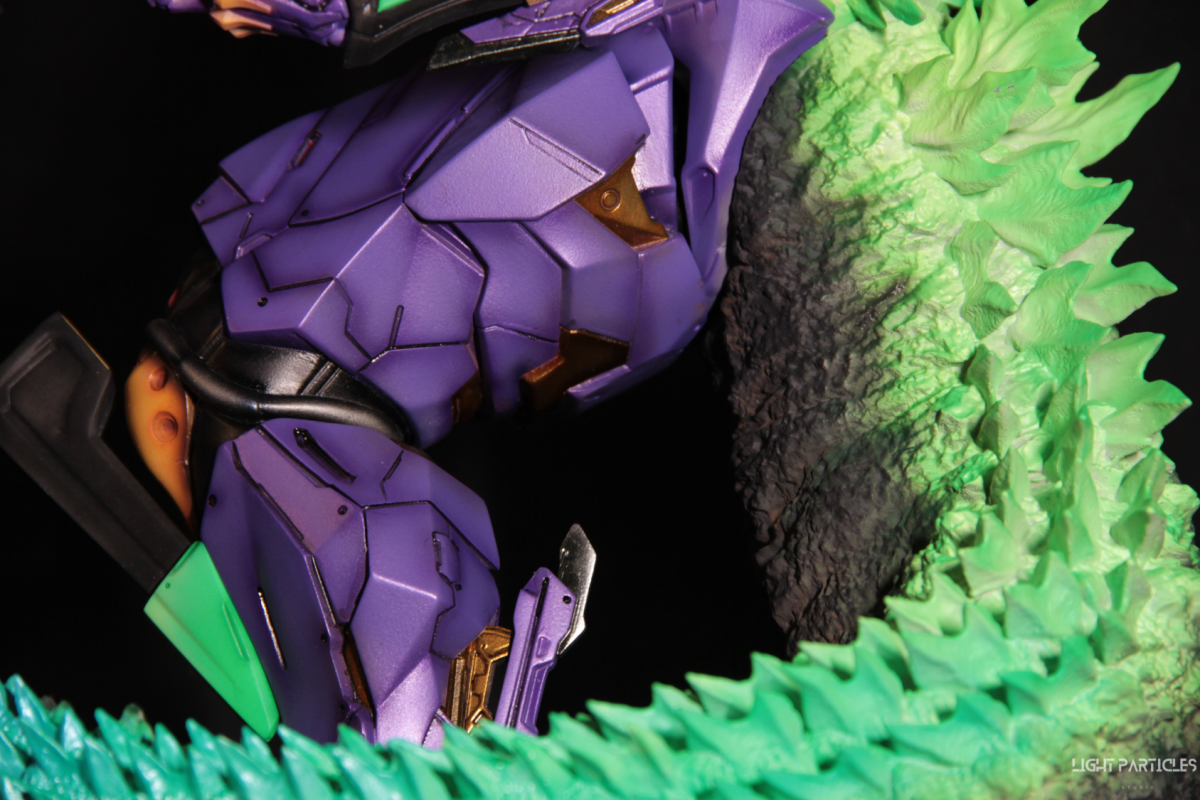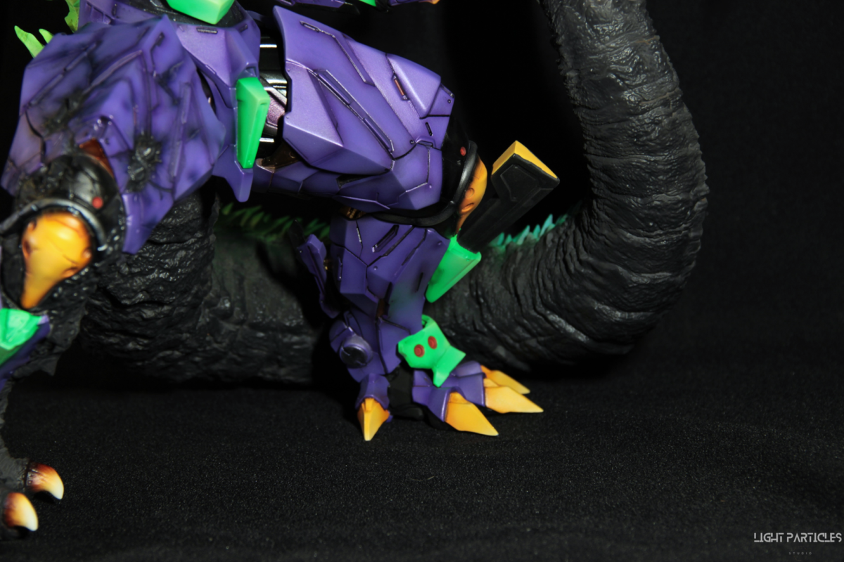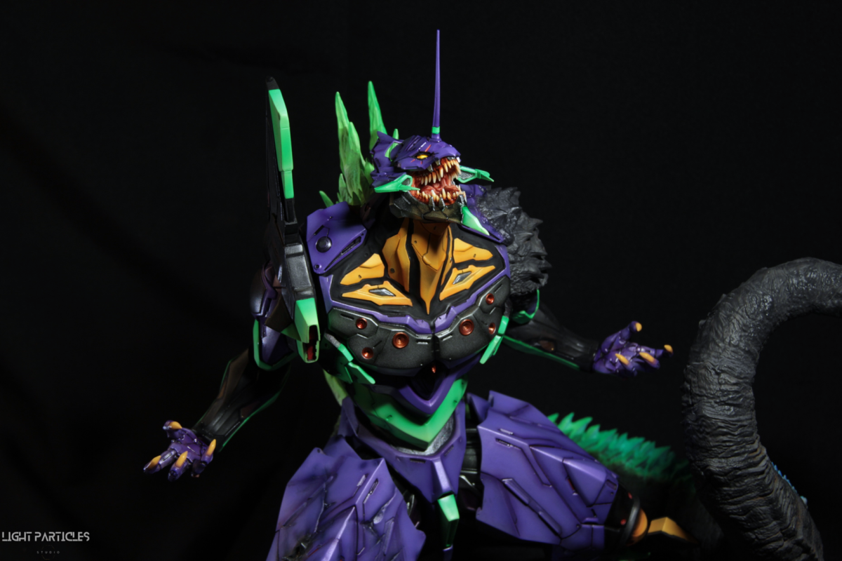 非常喜歡這組混合新世紀福音戰士以及哥吉拉IP設計的套件,分件也有將機械結構以及生物結構做一定程度的分件。但也是目前為止製作起來工序最繁多的套件。上色前的顏色測試也來來回回好多次,最後採用市售的EVA顏料做參考,自己調配出相近色調的珠光顏色。螢光綠部分也額外增加更亮的高光。在不搶走經典初號機配色的前提,機械部位也做更多顏色的分色。生物部分則是維持哥吉拉的基本配色,背鰭以螢光綠為主做出螢光色系漸層。希望大家喜歡這次的製作~