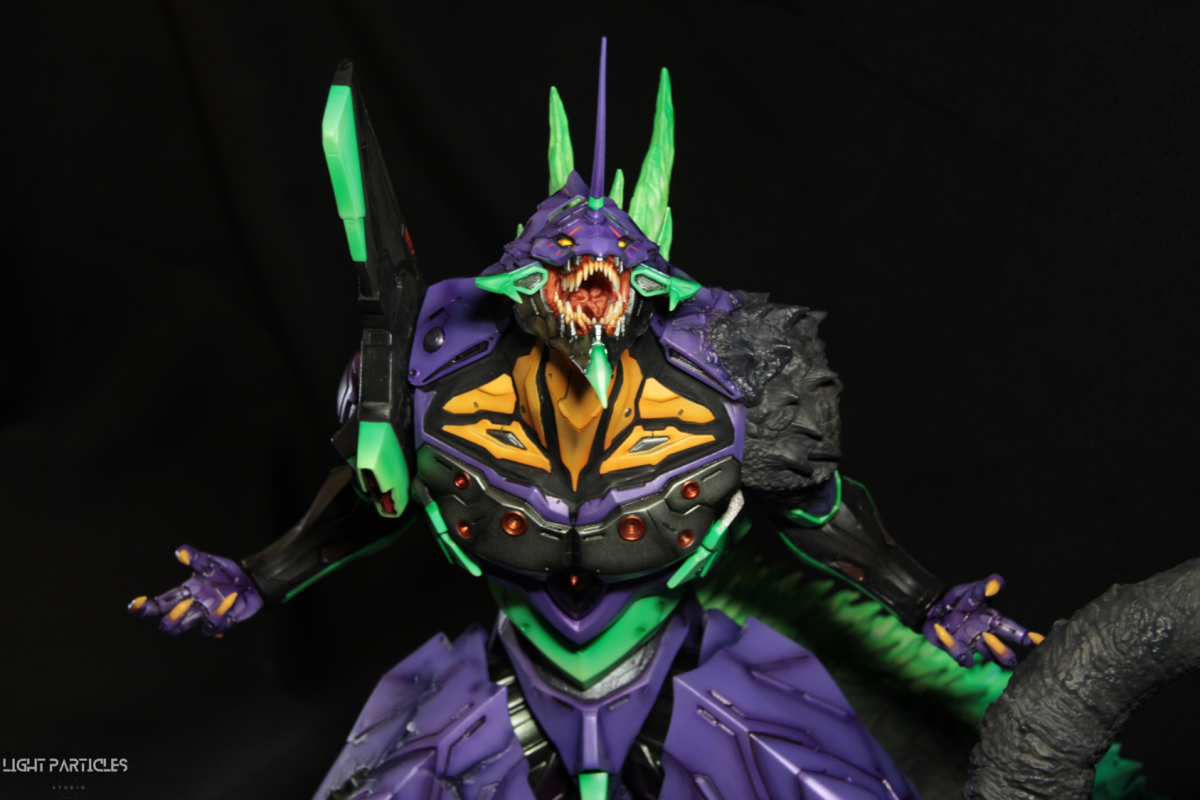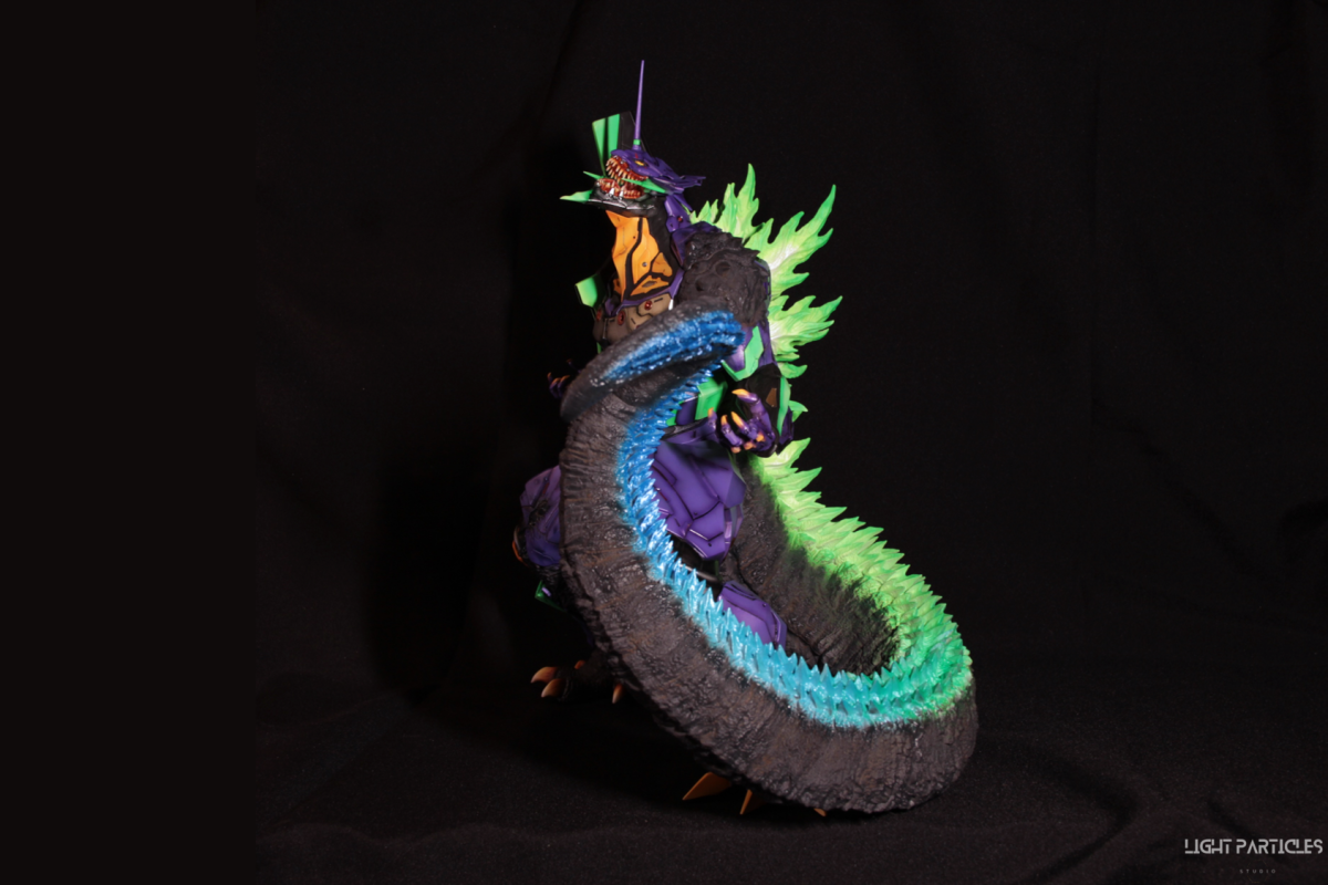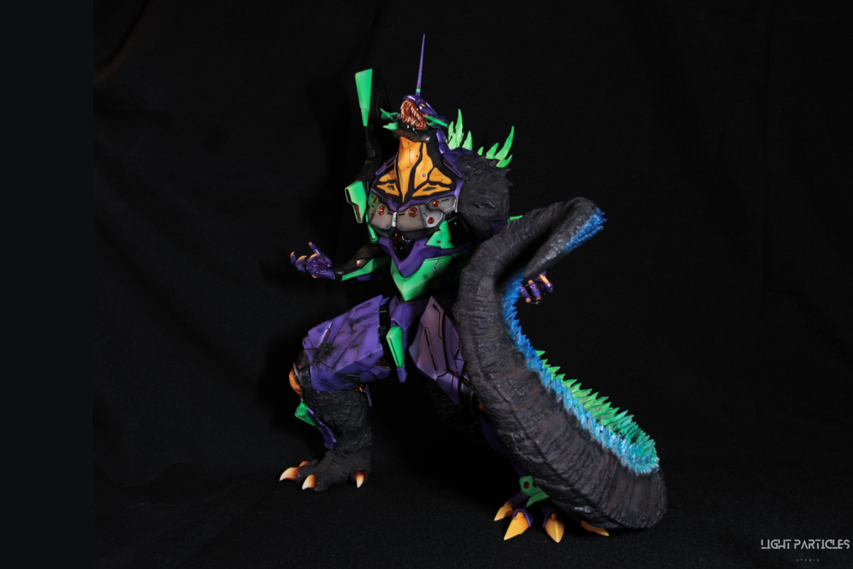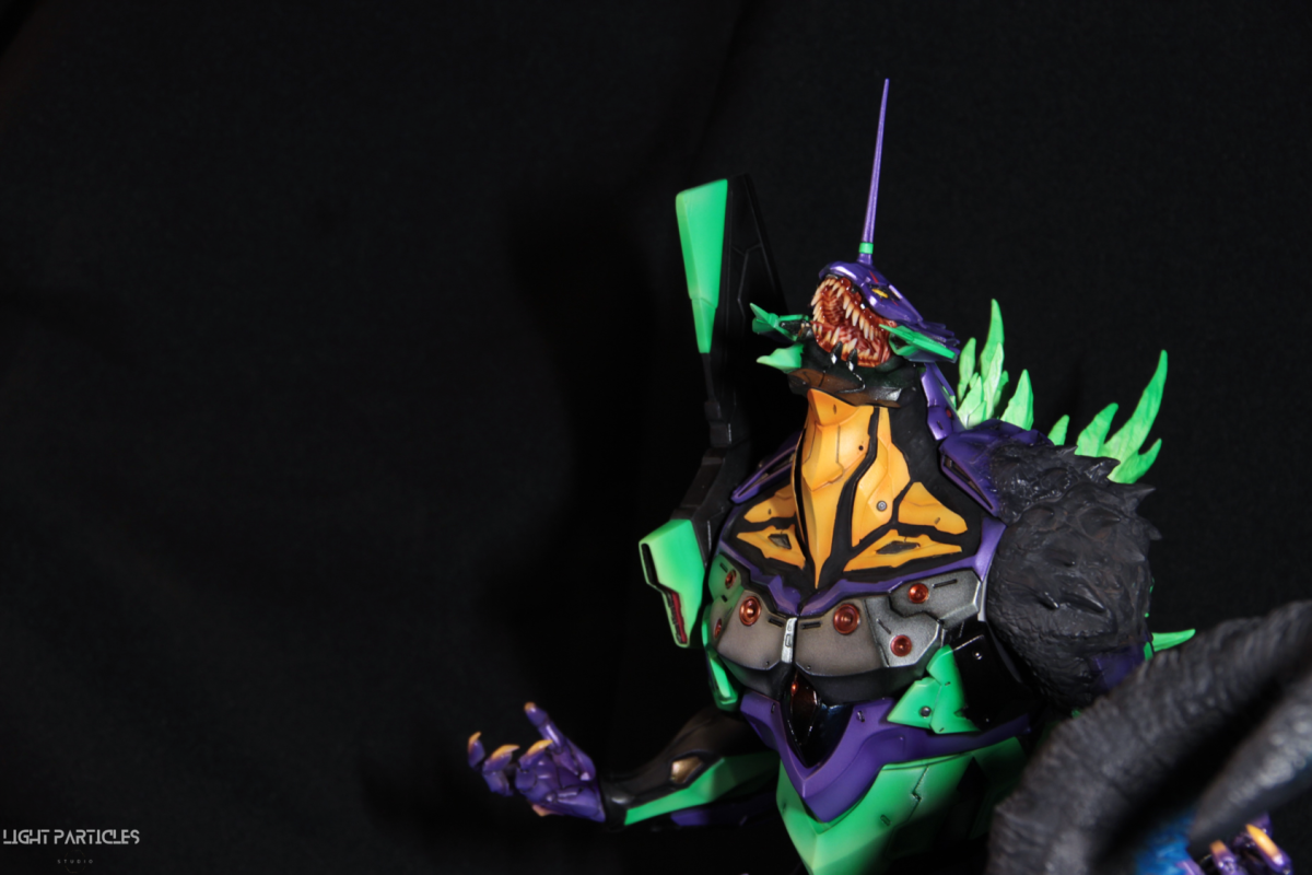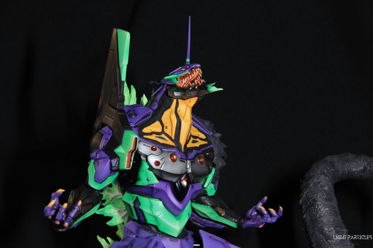 非常喜歡這組混合新世紀福音戰士以及哥吉拉IP設計的套件,分件也有將機械結構以及生物結構做一定程度的分件。但也是目前為止製作起來工序最繁多的套件。上色前的顏色測試也來來回回好多次,最後採用市售的EVA顏料做參考,自己調配出相近色調的珠光顏色。螢光綠部分也額外增加更亮的高光。在不搶走經典初號機配色的前提,機械部位也做更多顏色的分色。生物部分則是維持哥吉拉的基本配色,背鰭以螢光綠為主做出螢光色系漸層。希望大家喜歡這次的製作~