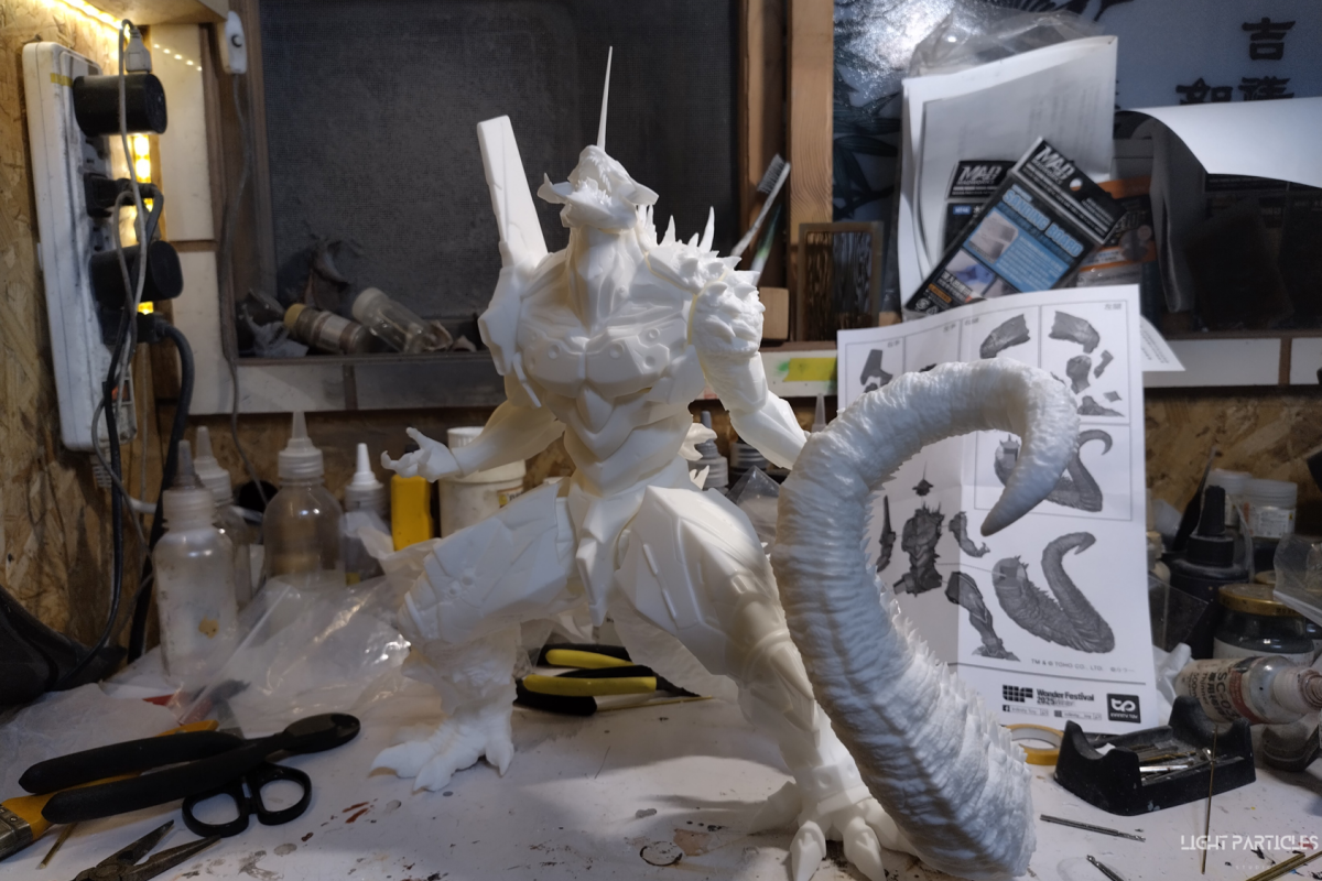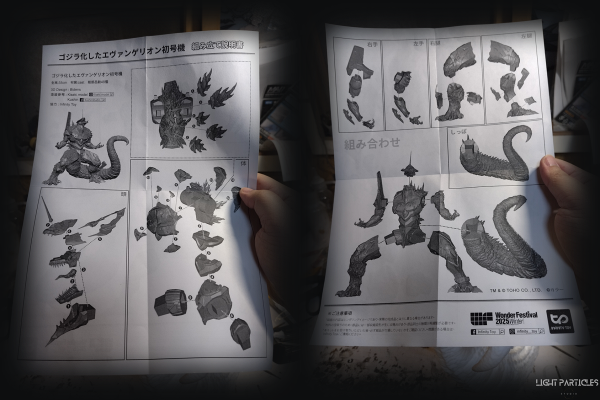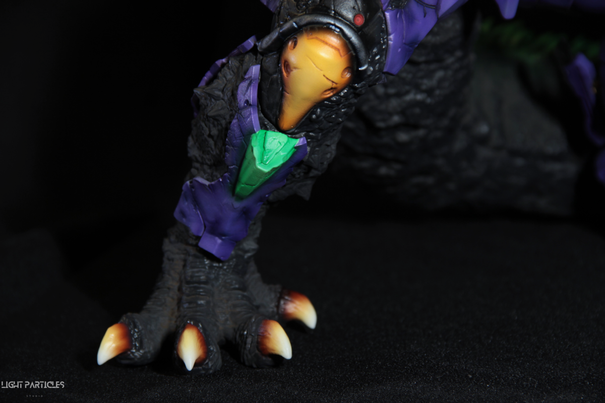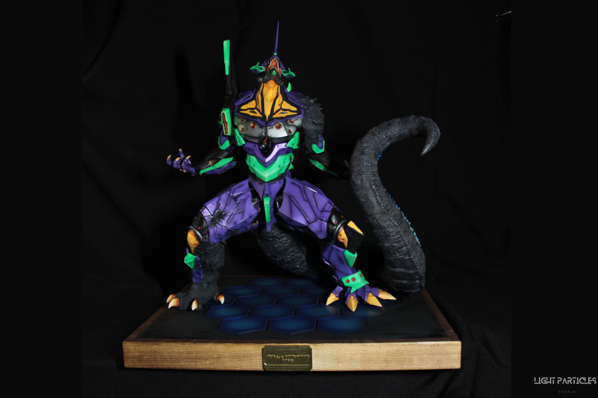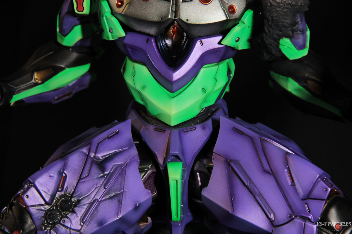 非常喜歡這組混合新世紀福音戰士以及哥吉拉IP設計的套件,分件也有將機械結構以及生物結構做一定程度的分件。但也是目前為止製作起來工序最繁多的套件。上色前的顏色測試也來來回回好多次,最後採用市售的EVA顏料做參考,自己調配出相近色調的珠光顏色。螢光綠部分也額外增加更亮的高光。在不搶走經典初號機配色的前提,機械部位也做更多顏色的分色。生物部分則是維持哥吉拉的基本配色,背鰭以螢光綠為主做出螢光色系漸層。希望大家喜歡這次的製作~