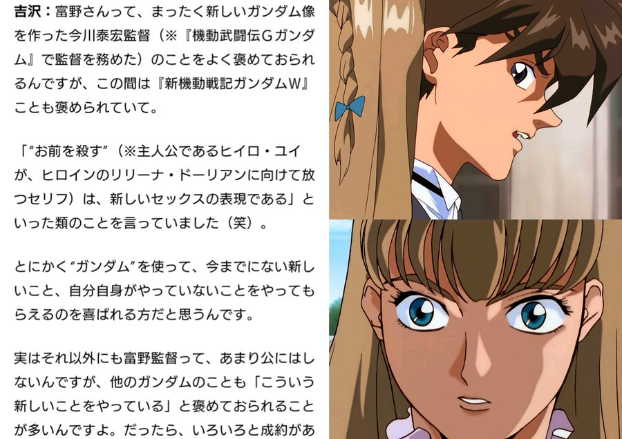 雖然這已經是多年前的訪談內容了,但不少網友粉絲仍對這樣的評語感到趣味,畢竟當年《新機動戰記鋼彈W》可是少有女性都追的鋼彈作品,這樣的評論當然也有他的意涵,畢竟『我要殺了你』當時可說是紅片大街小巷,大小朋友都當作一種告白無誤 ( ? ) 。