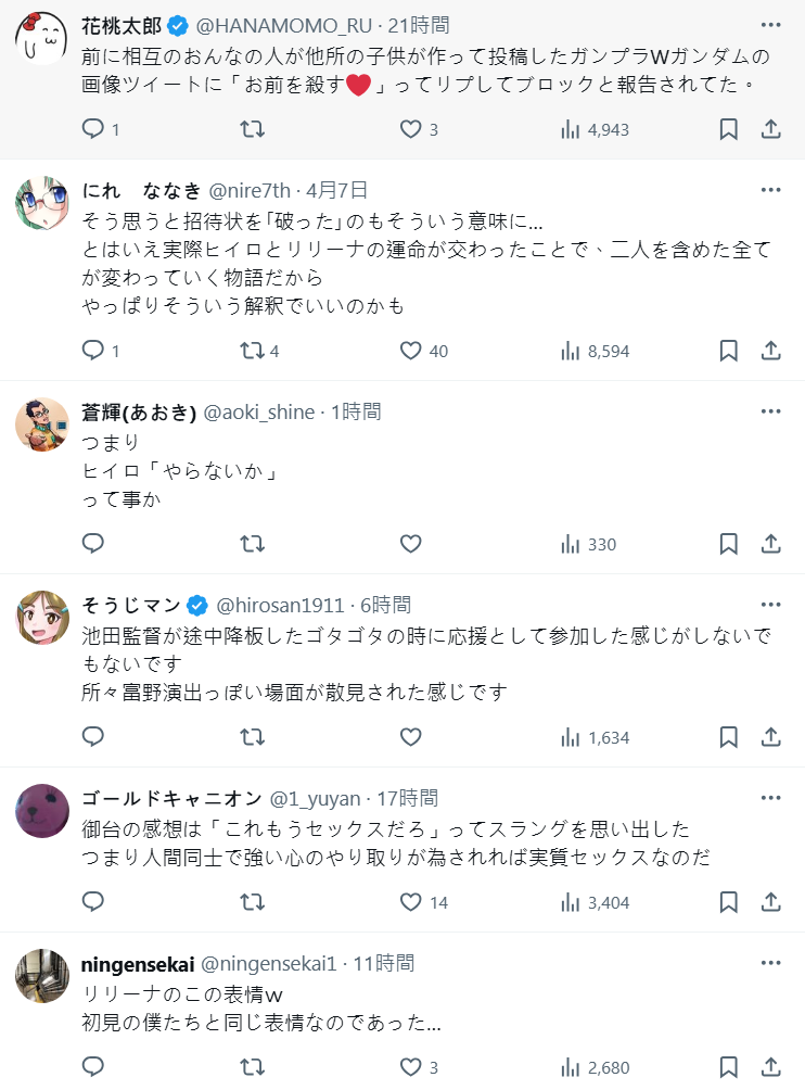 也就是說,只要人與人之間有強烈的心靈交流,本質上就跟做愛沒兩樣(?);也有網友表示,之前有一個跟自己互追的女生,跑去回一張別人小孩組的鋼彈W模型照片留言 : 「我要殺了你❤️」,結果就被對方封鎖加檢舉了(笑)。