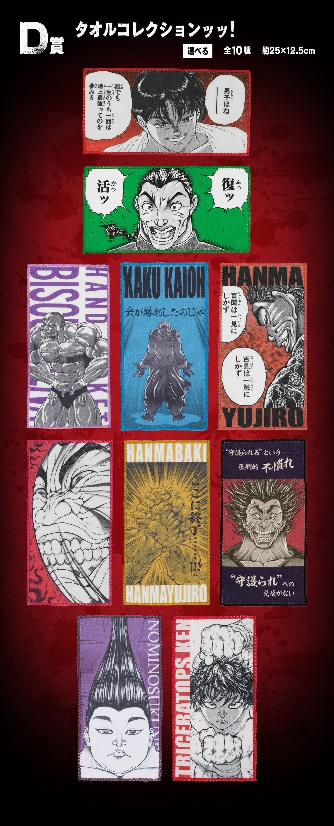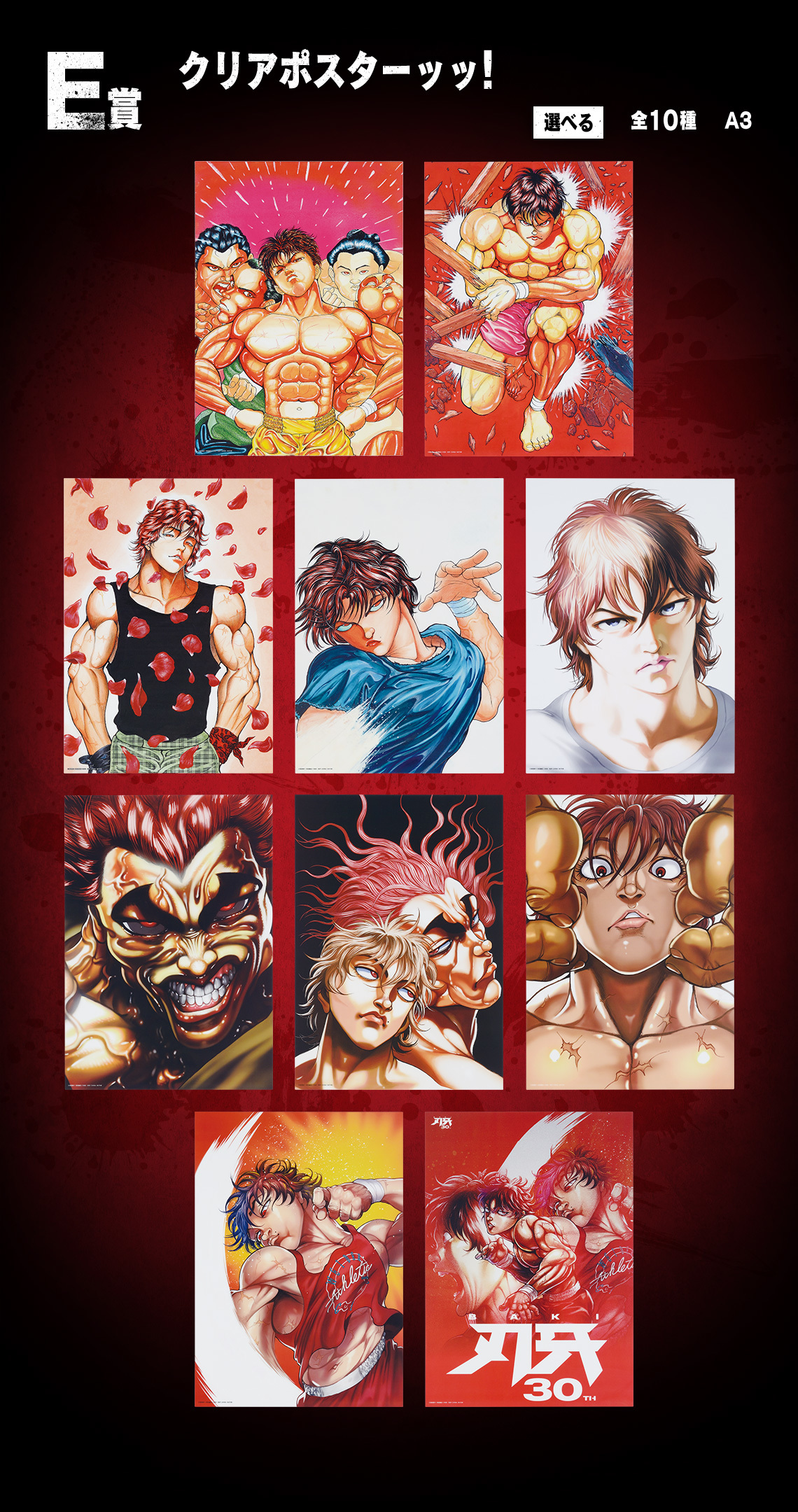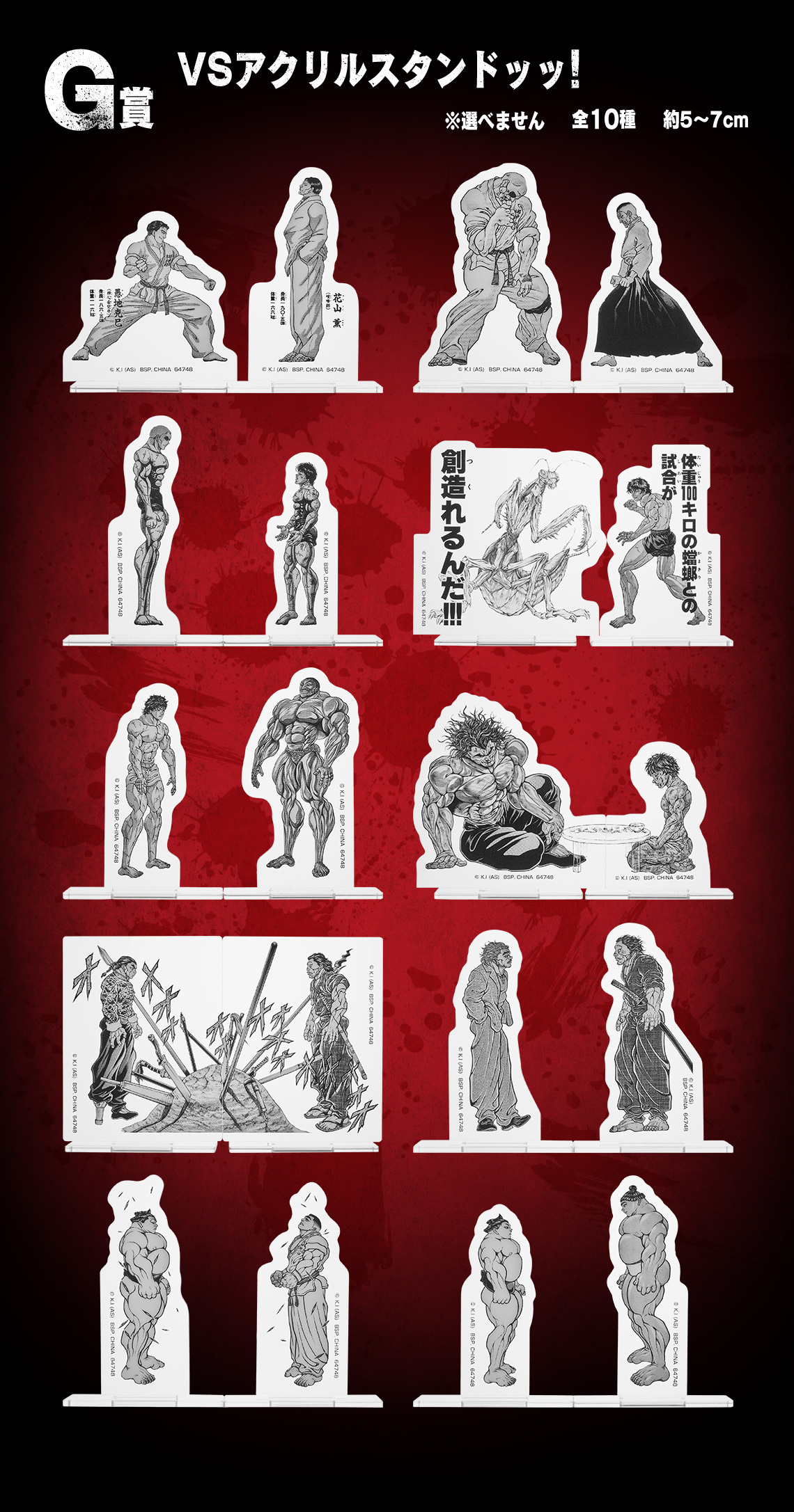 「一番賞 刃牙~一拳就能改變世界~」,收錄有A賞~G賞+最後賞等豐富的獎項,角色模型採用高階造型「MASTERLISE」系列打造,細膩再現精緻的服裝細節,並以約 25 公分的大尺寸呈現!陣容分別有:A賞範馬刃牙 MASTERLISEッッ!、B賞範馬勇次郎 MASTERLISEッッ!與爆衣版本的最後賞 範馬勇次郎 MASTERLISEッッ!最後賞!,生動的表情與極致狂暴的肌肉,連獎品名稱都很帶勁!另外還有再現經典土下寢的C賞西可爾斯基地毯!、D賞毛巾系列!、E賞透明海報!、F賞資料夾&貼紙套組!以及G賞 VS 壓克力支架!等熱血激昂的周邊商品~實在是非抽不可ッッ!