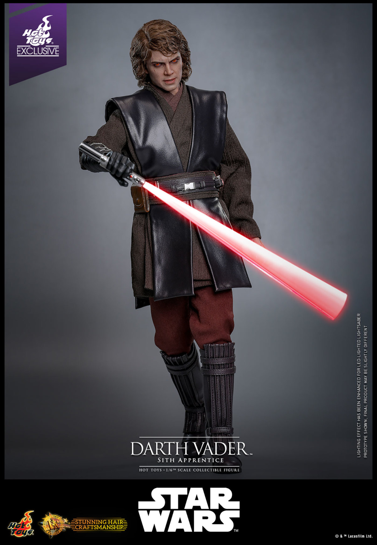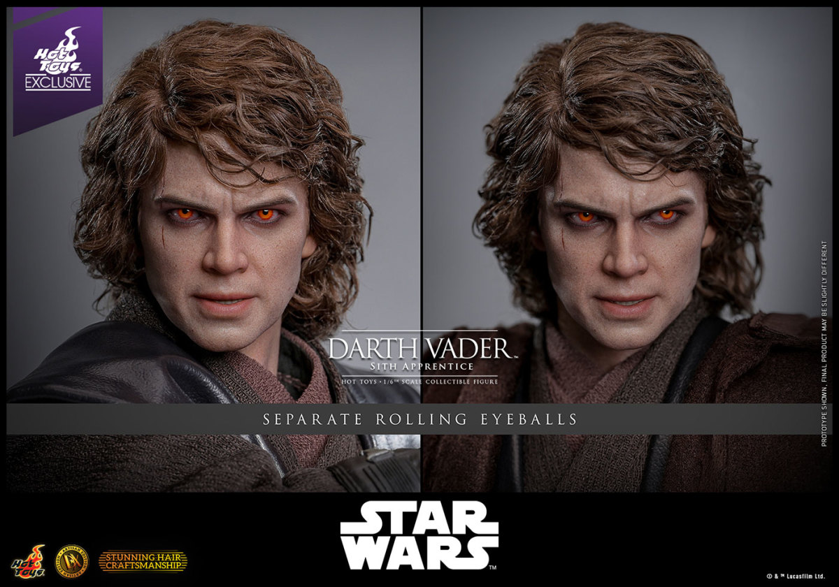 本次的Hot Toys達斯·維達(西斯學徒)高約31公分,精緻還原演員海登·克里斯坦森(Hayden Christensen)的面容,細膩捕捉出他對世界充滿著憤怒的神情與臉上的傷疤細節,重現了令人不寒而慄的紅色的瞳孔,並可以透過可動眼球技術調整眼神方向依需求擺設!而這次的Artisan Edition植髮版本更以精巧的工藝一根根將安納金的頭髮植入,披頭散髮的樣子更貼近劇中墜入原力黑暗面後的形象!