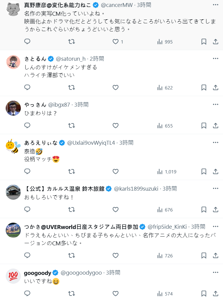 相較於先前未揭露演員的評價,現在正式公開影片後評價可說是翻轉,不少人認為選角優秀外,演出的效果也的確也頗有趣。就跟過去《哆啦A夢》、《櫻桃小丸子》製作過長大後的真人版本一樣,有著不同於原作卻又和諧的味道。