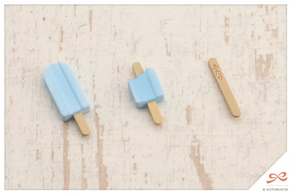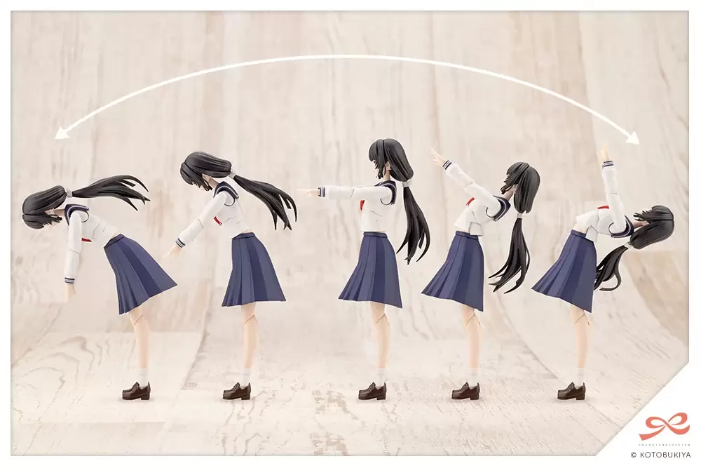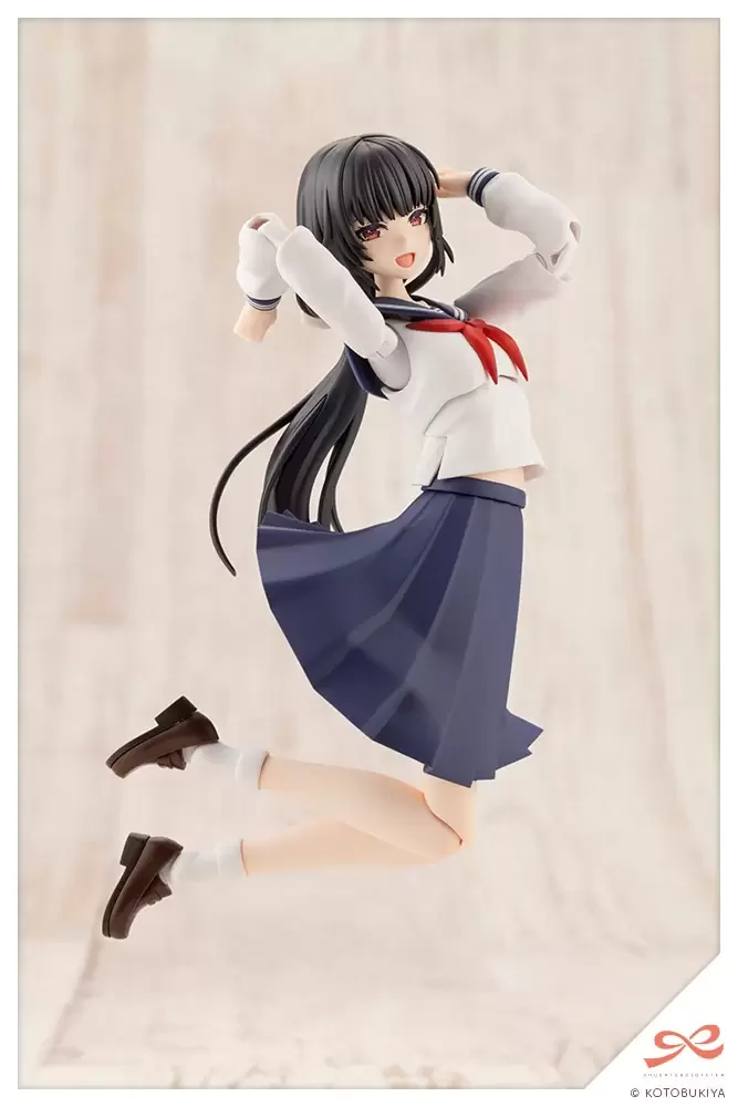 上半身零件沿用【篝火真里亞・衣裝】的水手服規格,領口、袖口的白色線條已預先塗裝完成,具備拉出式肩關節、雙重關節手肘、胸・腹部的前後左右扭動關節、頸部球形關節可前後滑動等可動設計,能夠搭配新規展示台座、冰棒、書包、手機等配件,把玩出各種靈活的姿勢。