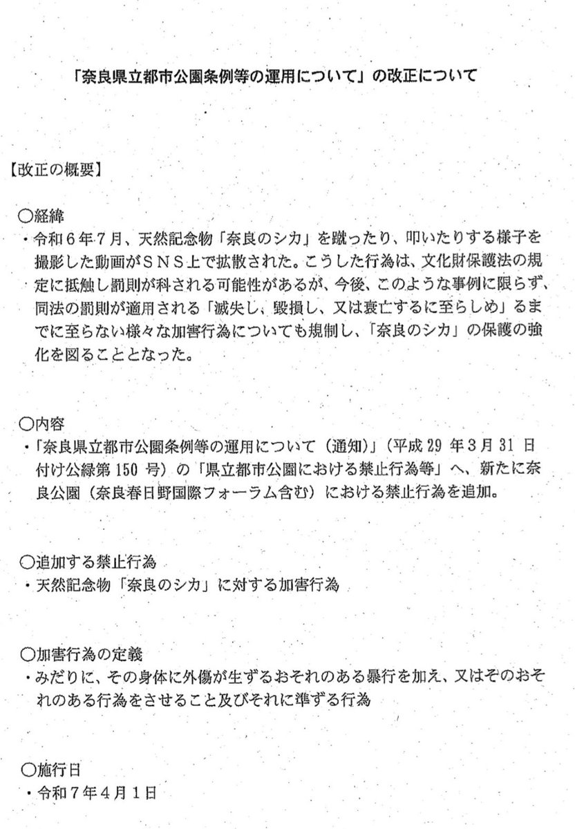 根據奈良縣公布的修正內容,將針對《奈良縣立都市公園條例等的運用》中的禁止事項,新增「對天然紀念物奈良鹿的加害行為」為明文禁止項目。所謂「加害行為」,是指對鹿施加有造成身體傷害風險的暴力行為,或是其他可能讓鹿感到痛苦或不安的舉動。這些行為不論是否造成實際傷害,只要具備威脅性或類似特徵,也將被視為違規。