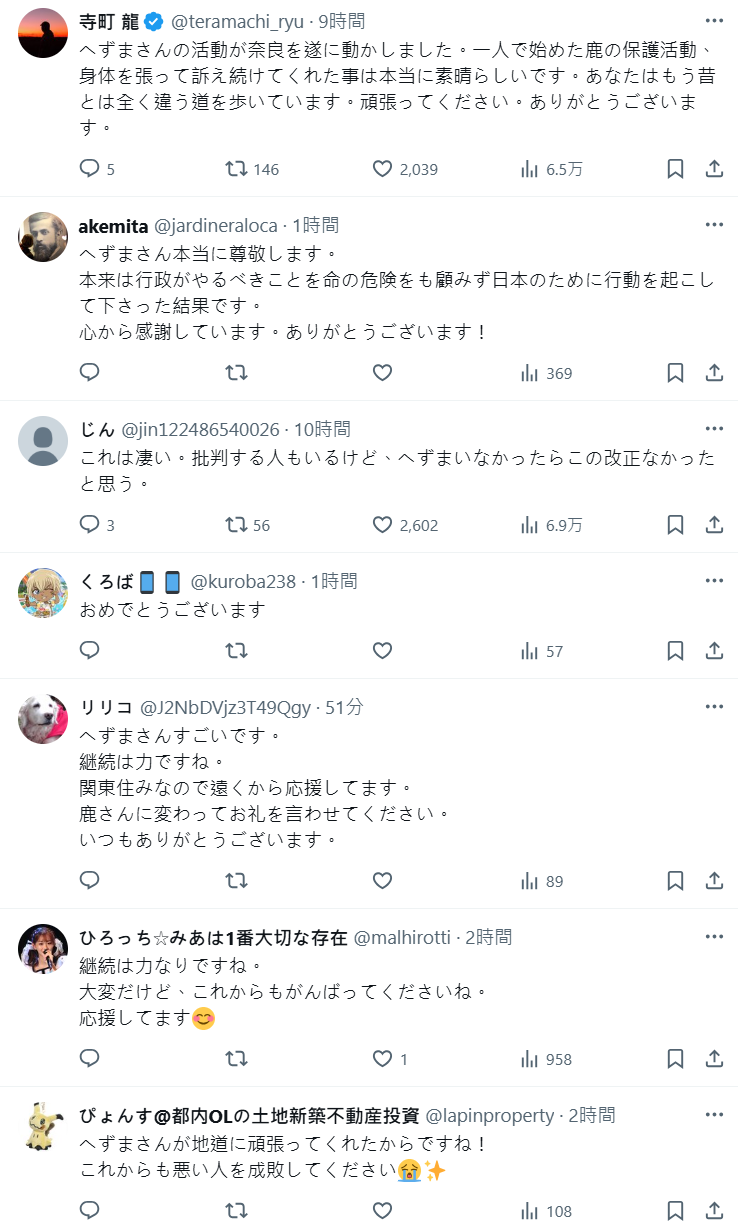 對此條例修正頒布,護鹿團體的倡議人也表示,持續做了 9 個月的鹿鹿保護行動,終於讓奈良的政府機關出手了。對奈良鹿的「暴力行為」現在正式被列為禁止事項了,現在終於可以稍微鬆一口氣了。