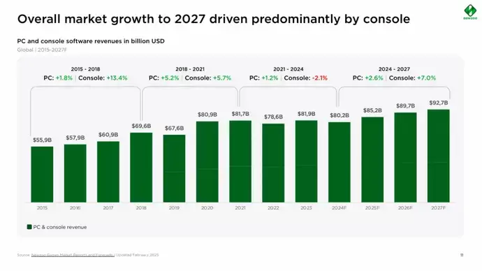 報告顯示,從 2024 年到 2027 年之間,PC 遊戲市場將成長 2.6%,而家用主機市場則預期成長 7%。這波成長不僅來自硬體與軟體銷售的同步推升,也受到高單價遊戲作品的影響。