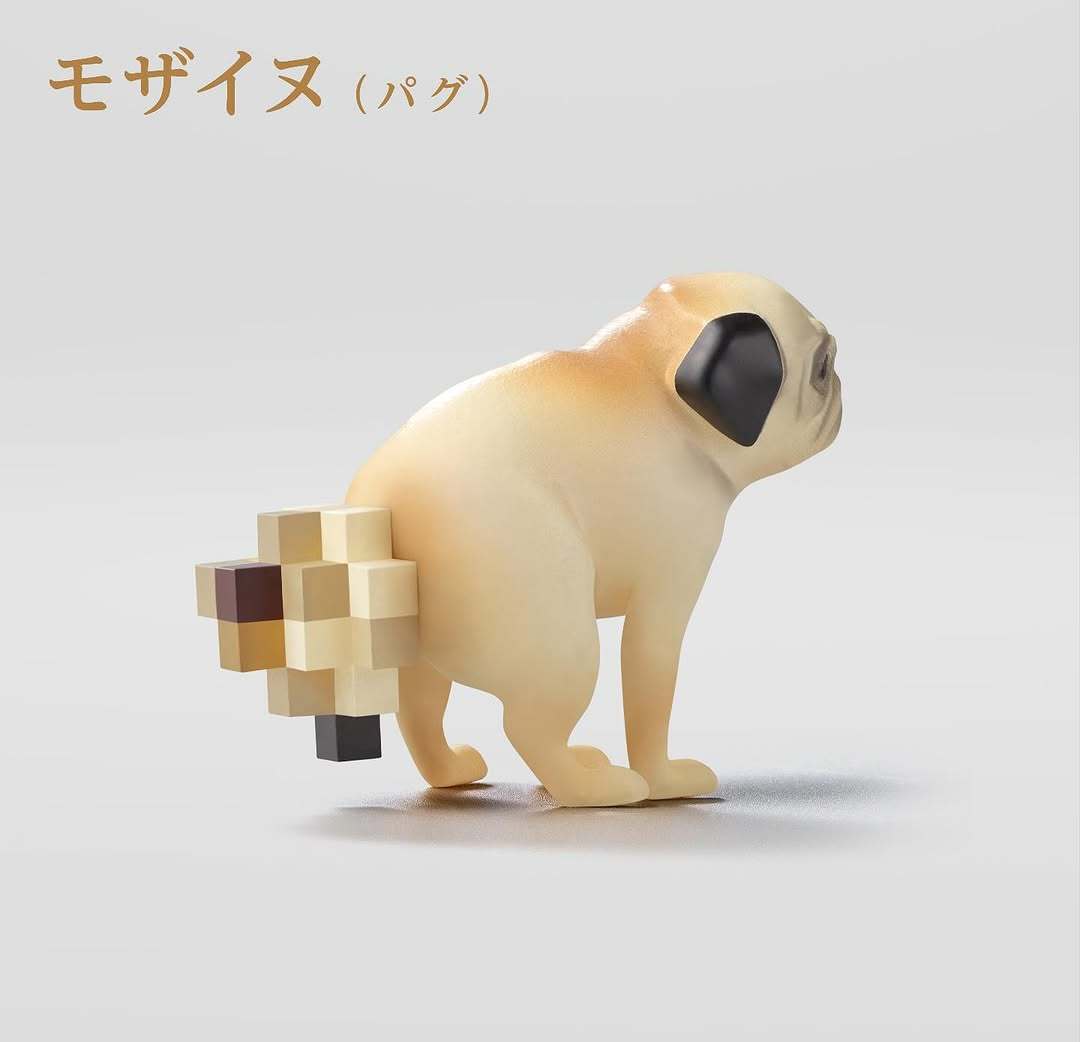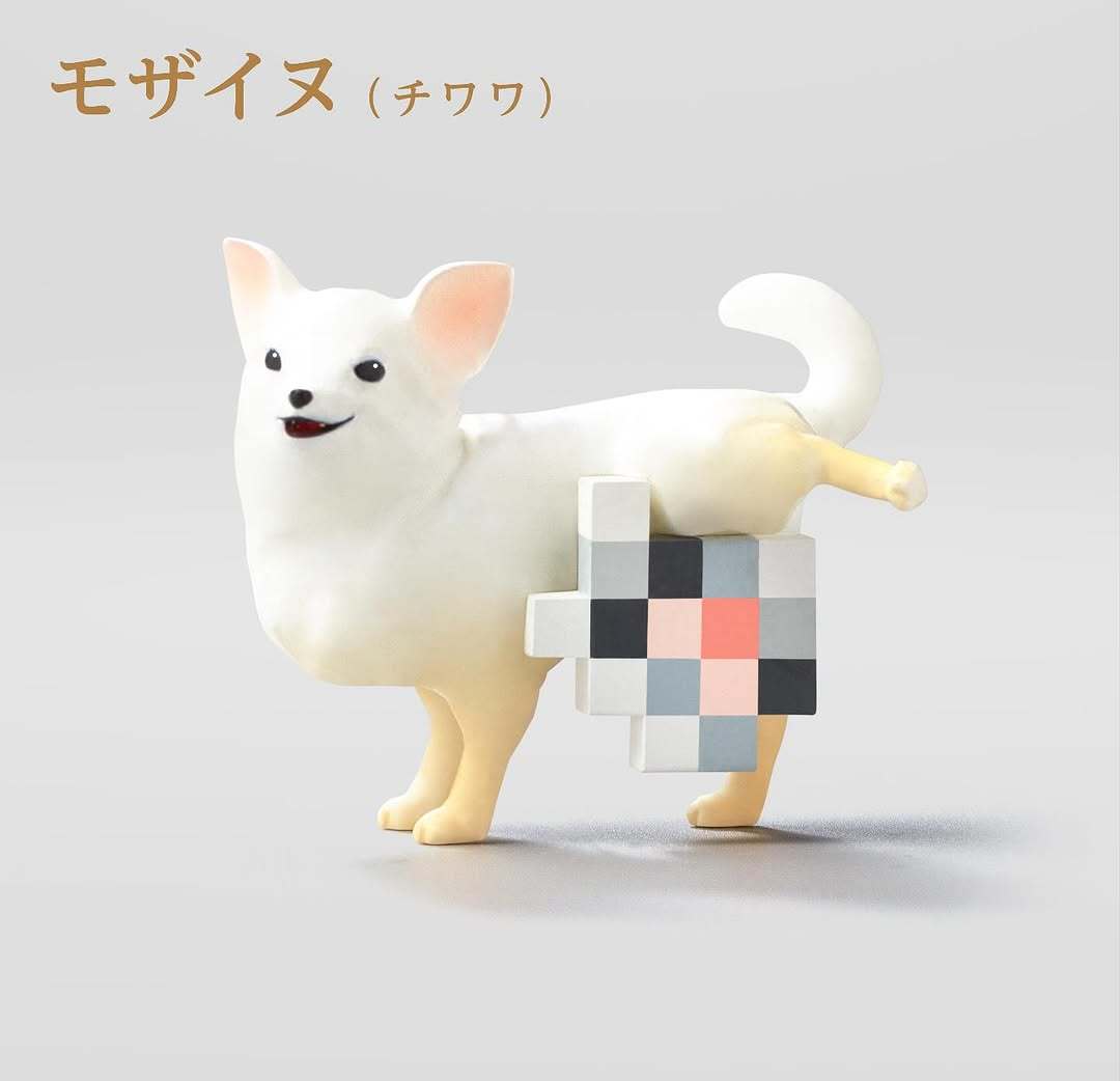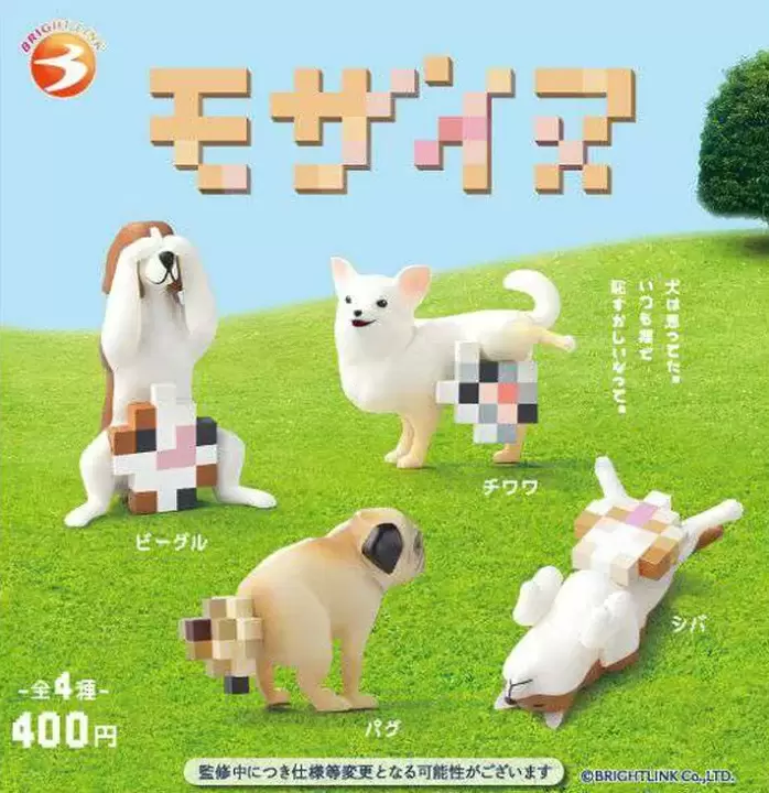 BRIGHT LINK「馬賽克」轉蛋,在狗狗身上的重要部位放上方塊狀造型,呈現打馬賽克的禁忌效果!收錄有:抬腿的吉娃娃、遮住眼睛的米格魯、蹲便便的巴哥犬,以及仰躺的柴犬,尤其馬賽克中還出現謎樣的粉紅色,或是便便般的深咖啡色,不禁更讓人產生聯想...!