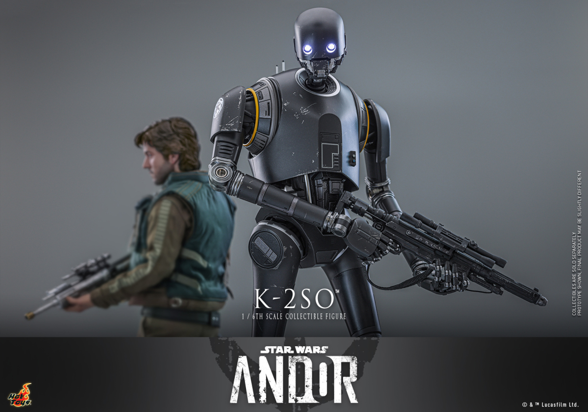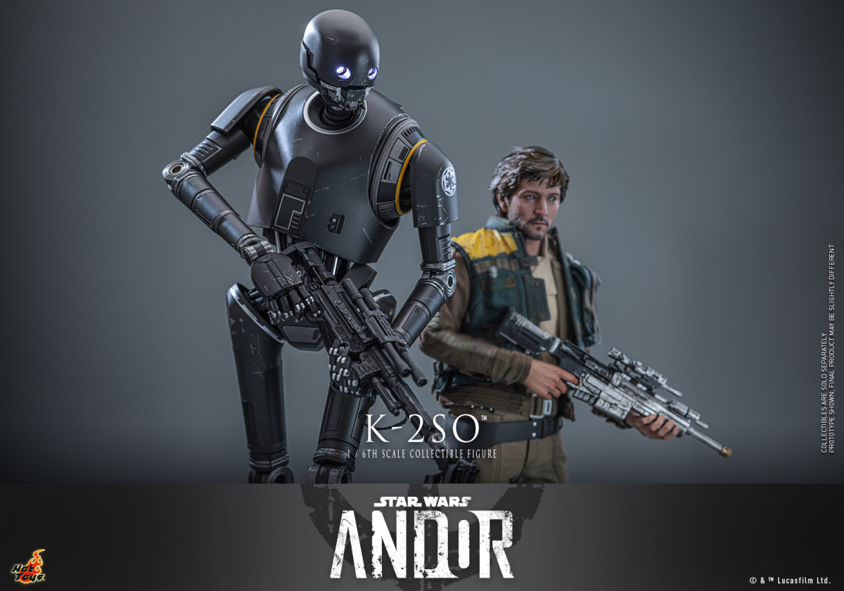 本次的K-2SO1/6比例收藏級可動人偶高約36公分,還原了他對比安道爾的巨大身形,全身做有30處可動,雕刻細膩的重現帝國保全機器人圓弧滑順的機械結構設計,並塗裝出身上的刮痕等細節!眼睛部分作有LED發光功能且具有旋轉可動可以微調視線,配件部分附上了一把爆能手槍、一把爆能步槍,可以與同步發售的安道爾一起展示,再現兩人在《俠盜一號》中的冒險!