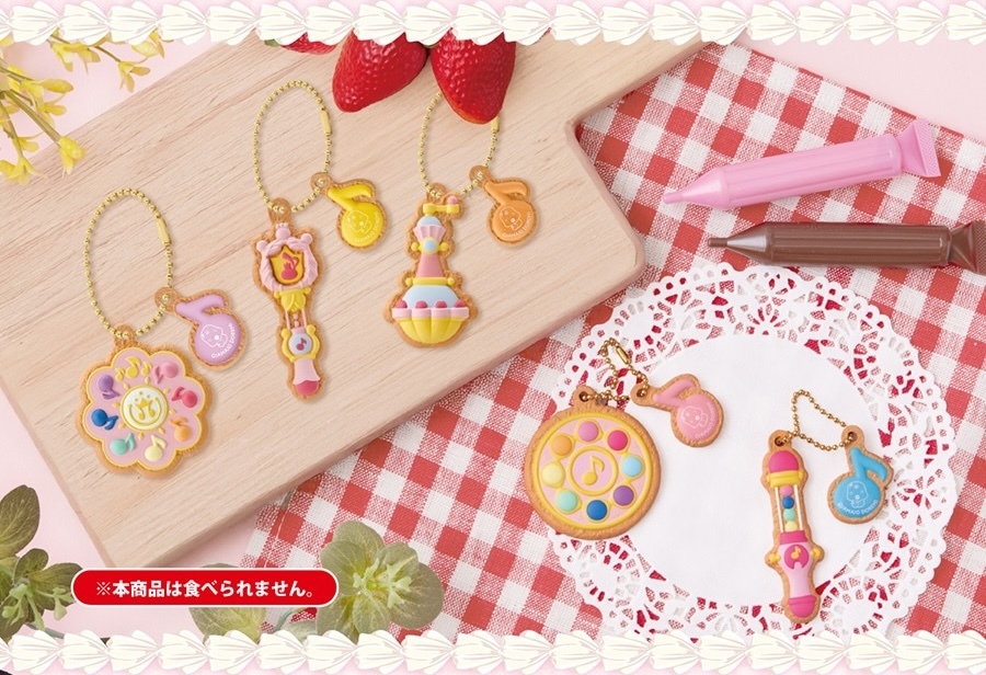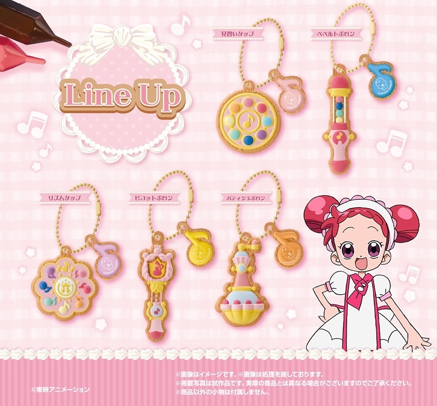 本次的「小魔女DoReMi Sweet×Sweets吊飾」轉蛋便是以動畫第三季《大~集合!小魔女DoReMi》製作甜點的主題為發想,將作品中的多款人氣道具製作成約5.3公分大的糖霜餅乾糖霜餅乾造型吊飾,收錄見習生轉換器、貝貝魯多波龍、旋律轉換器、花邊波龍以及糕點師波龍五種款式,將道具的造型簡化轉換成糖霜餅乾的圖樣,且每款金色的球練上都會附上另一塊印有魔女莉卡、八分音符形狀的糖霜餅乾,看起來可愛又可口,喜歡《小魔女DoReMi》的各位玩具人不要錯過啦!