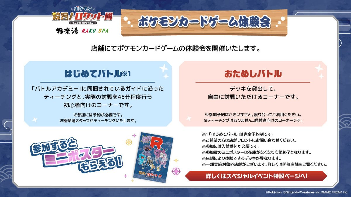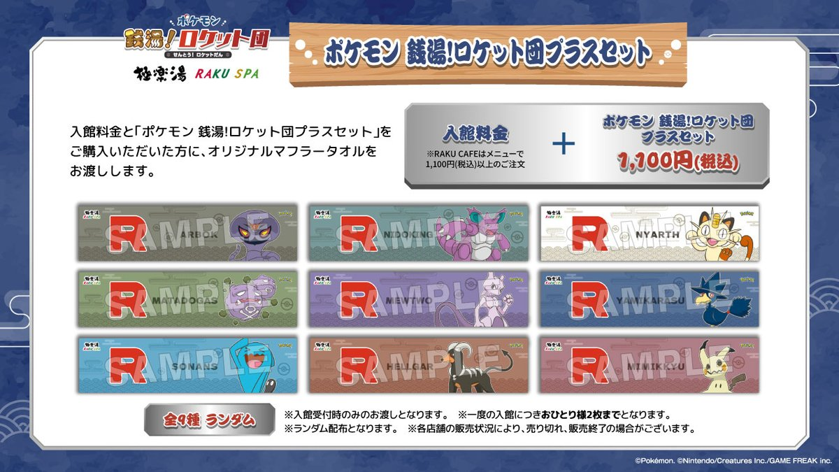 這次活動是配合 4 月 18 日發售的《寶可夢集換式卡牌》擴充包「火箭隊的榮耀」,所以才以「火箭隊」為主題打造活動,可以看到許多出現在動畫中的火箭隊寶可夢,除了許多原創週邊商品販售之外,入場購買「ポケモン 銭湯!ロケット団プラスセット」 套組,即贈送應援毛巾,共計十款隨機贈出。