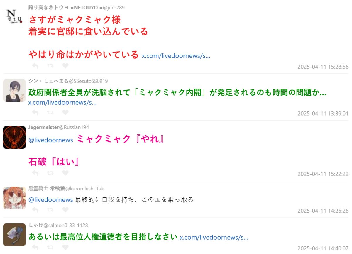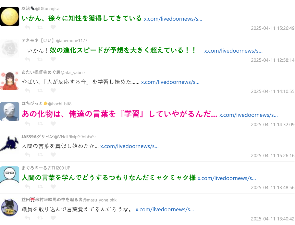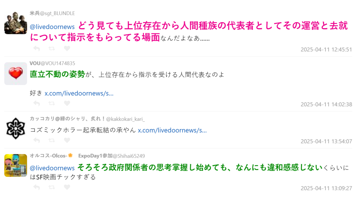 由於石破首相全程幾乎立正跟脈脈對話,這樣的畫面也讓網友戲稱「好像什麼科幻作品的場面,跟人類的高階代表談話,真的越來越有趣了 www。」