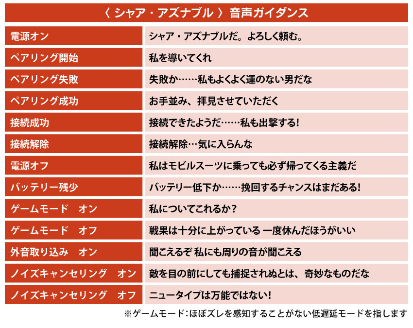 最大亮點是有阿姆羅(CV:古谷徹)與夏亞(CV:池田秀一)全新錄製的語音提示,像是開關機、配對成功、觸控操作等,共 13 種語音提示,完全是粉絲收藏等級!
